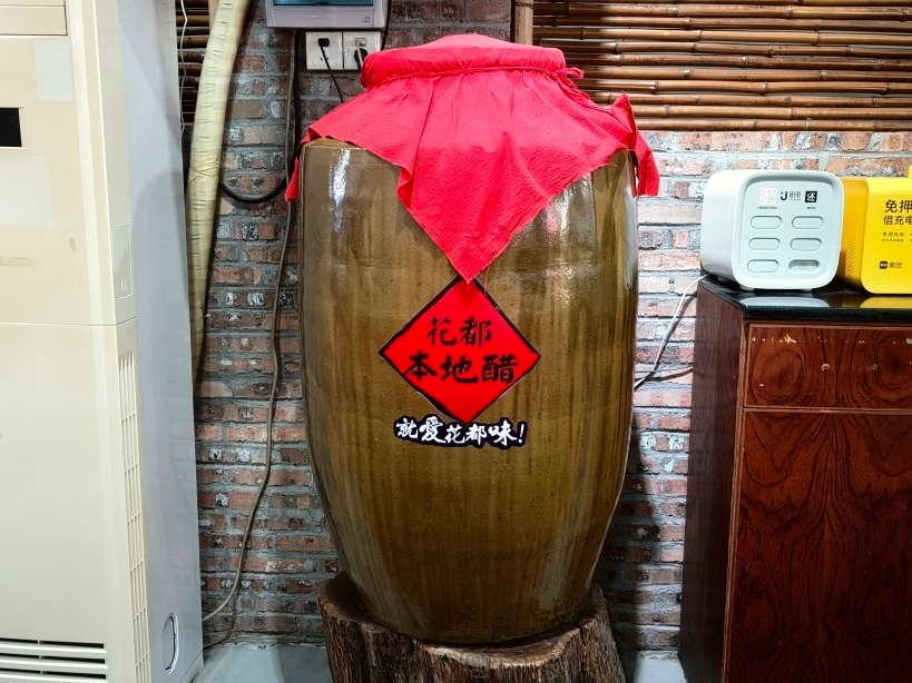 刚来到芝兰小苑门口,目光就被抬头“特色本地醋——花都区非物质文化遗产”数个白体红底字样所吸引,左边墙上更是挂了一幅惟妙惟肖的醋坛子画像,上面标注“花都本地醋”。走进店内,随处可见各种各样形状奇特的醋坛子,其中最大的有等人大小,放在店内招纳食客。每个进去的人都会情不自禁地围绕着醋坛打量几番,听店员讲述几句“臭屁醋”的历史传说。