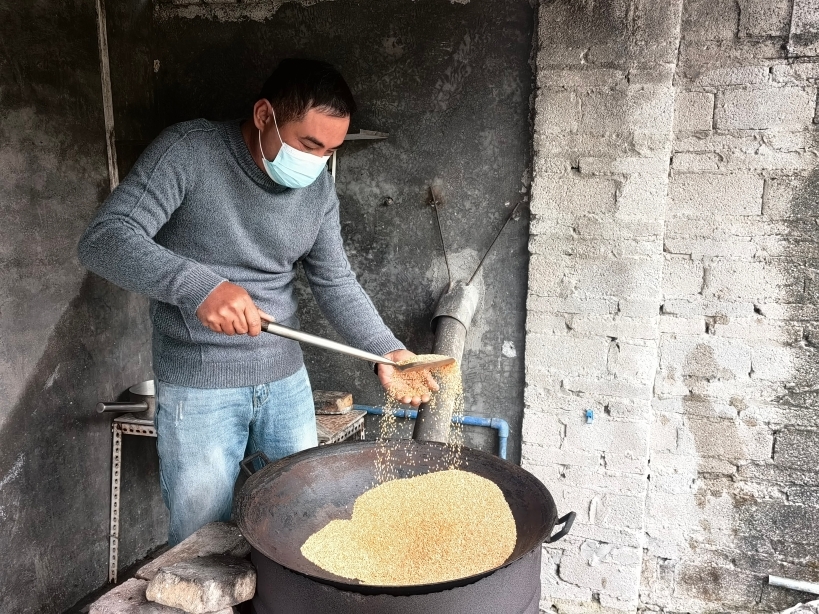 黄伟华表示,酿醋的第一步就是选材,平时吃的米比较细软,不适合作为酿醋原料,所以一般都会选用糙米和糯米,但是不同米酿制出来的醋的味道和酸度都会有所不同,为了能够让米更好地发酵形成米浆,黄伟华专门从江南进口成吨的碎米加工,这样酿制出来的醋才会更醇更入味。把碎米倒入大锅后,就是酿醋最关键的一个步骤——炒米。在土灶里加入一定数量的木材点燃后,黄伟华拿起一把大铁铲炒起米来。“为什么要炒米?就是要把米中霉气细菌炒出来,以便更好地封存发酵。炒大米的时候一定要很有耐心,不能着急,看到烟味不断出来后,更要用铲子不断地翻炒。”大约炒了40分钟左右,锅里的米色逐渐由白色变成金黄色,散发出浓郁的香味。“炒米必须要炒到金黄色为止,不能太深也不能太浅,这样刚好锁住米中的营养。要谨记的是,炒焦的黑米一定要及时捞出来,不然糊味会覆盖掉醋的香味。”