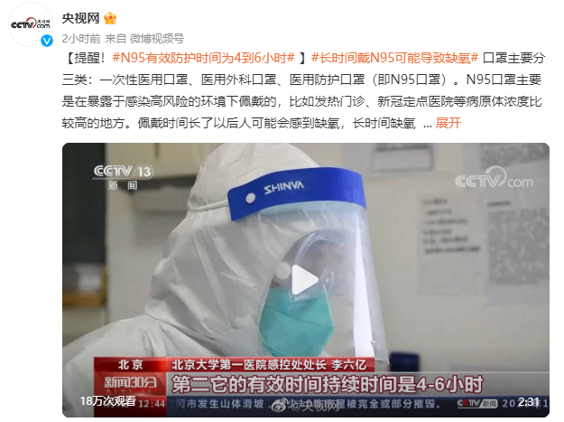 口罩主要分三类:一次性医用口罩、医用外科口罩、医用防护口罩(即N95口罩)。N95口罩主要是在暴露于感染高风险的环境下佩戴的,比如发热门诊、新冠定点医院等病原体浓度比较高的地方。佩戴时间长了以后人可能会感到缺氧,长时间缺氧容易感到疲劳,对心和脑产生影响。