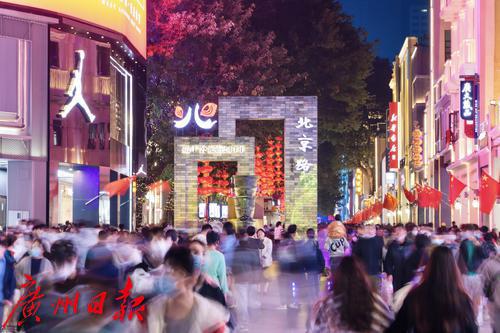北京路步行街,游人在拍摄热闹的街市场景。