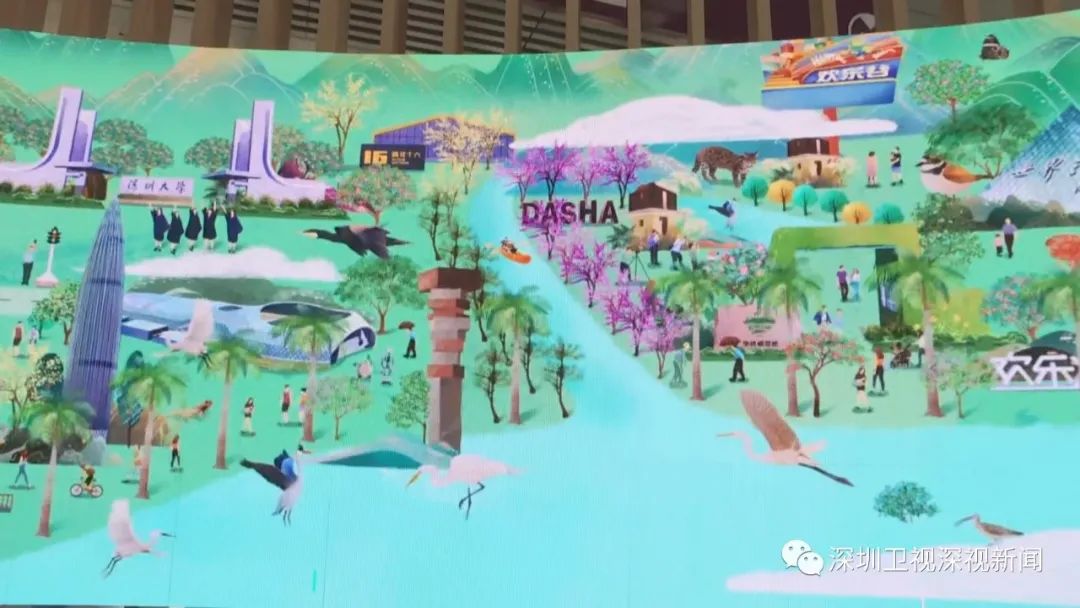 跟随镜头往前走,一幅栩栩如生的动画作品映入眼帘,据了解这是深圳本地插画艺术家创作《千园之城-深圳40周年》动态长卷作品,20位画师耗时118天打造的手绘长卷,绘制了近300个物种与深圳十个区的主要公园和地标建筑。