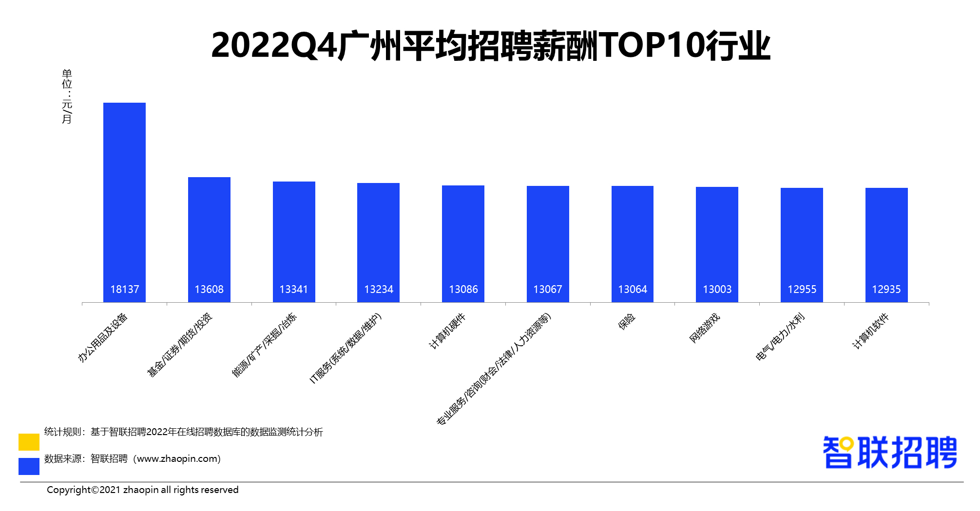 行业方面,四季度金融、IT互联网行业薪酬仍然较高。高科技产业知识密集,技术密集,研发人员规模占比大,行业薪资待遇总体较高。四季度电子技术/半导体/集成电路(12276元)、IT服务(12042元)、计算机软件(11940元)、计算机硬件(11392元)、通信/电信/网络设备(11339元)等行业在招聘市场上火爆,航空/航天研究与制造、医药/生物工程、仪器仪表及工业自动化等薪酬水平也较高。