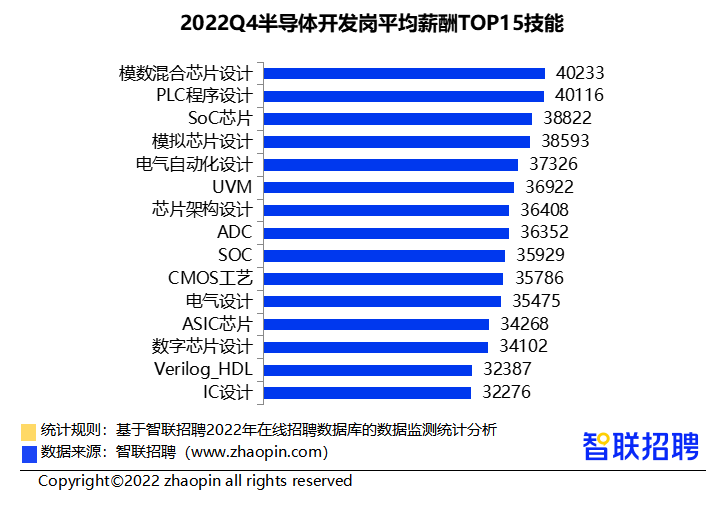 对于技术性强的职业,掌握其关键技能成为获取高薪的关键。四季度,半导体开发岗(电子/电器/半导体/仪器仪表)的高薪技能榜中,芯片设计技能的薪酬居于前位。