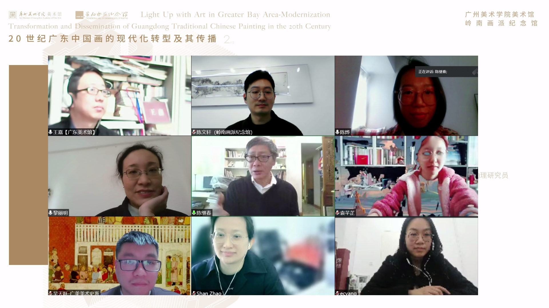 2022年上半年第一階段,系列講座邀請到了香港理工大學駐校藝術家黎明作《嶺南畫派一代宗師——高劍父的藝術教育》主題講座,澳門美術協會藝術顧問陳繼春分享《廣東繪畫的轉變——從十香園到春睡畫院》,香港藝術館一級助理館長劉湘瀅講述《高劍父的市場推廣藝術》,暨南大學博士Giacomo Bruni剖析《高奇峰的海外展覽及教育思想》,香港中文大學文物館副研究員童宇講述《廣東人在北京:清末民初北京的粵籍官員、書畫家和鑒藏家》,中國國家博物館研究館員朱萬章則以《守望傳統與借古開新——二十世紀文化語境中的國畫研究會》為題分享。