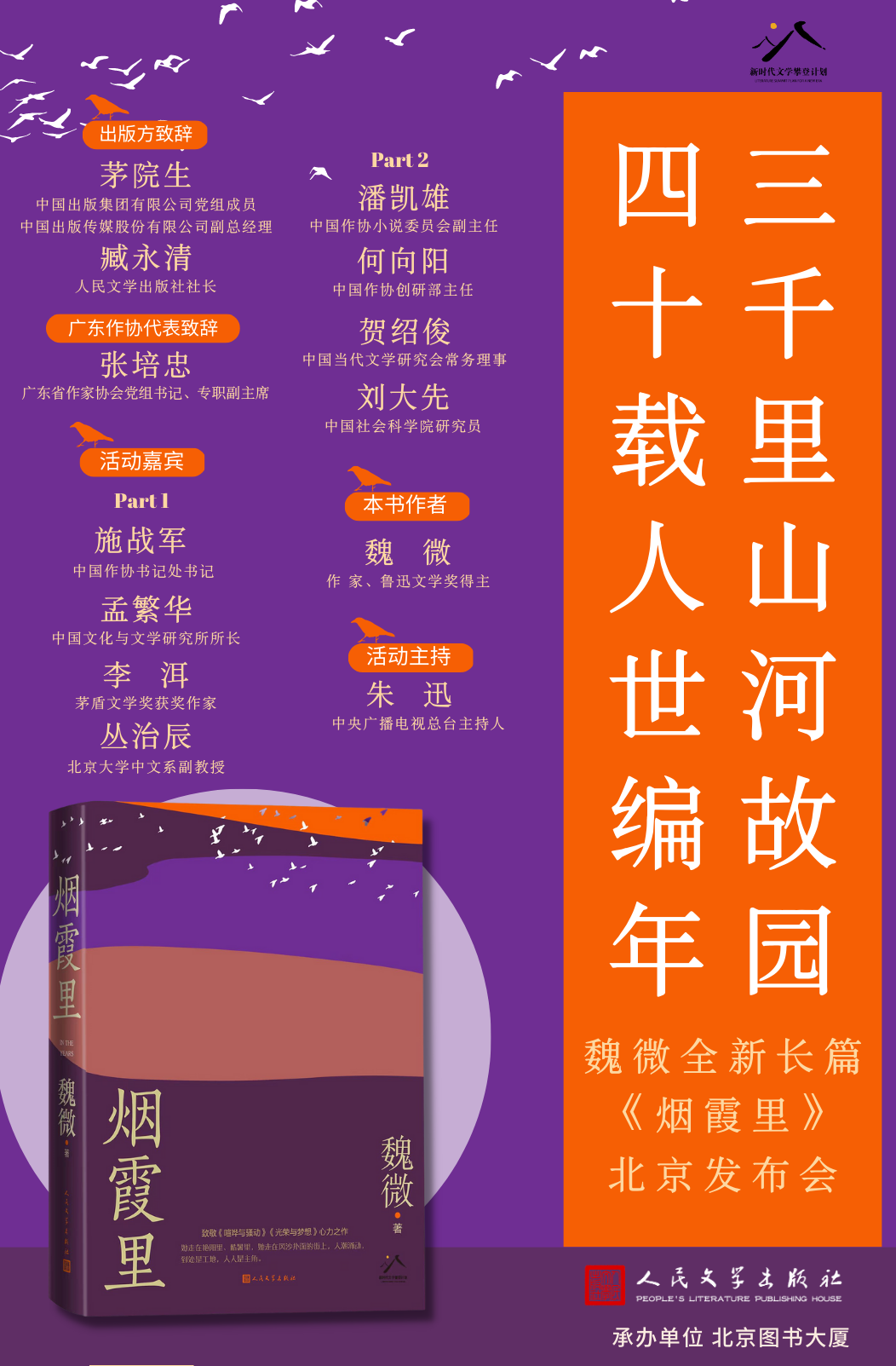 将出席发布会的嘉宾有:北京大学教授、茅盾文学奖得主李洱 ,中国作协小说委员会副主任潘凯雄 ,中国作协创研部主任何向阳 , 中国作协书记处书记、《人民文学》主编施战军,中国文化与文学研究所所长、沈阳师范大学特聘教授孟繁华 ,广东省作家协会党组书记、专职副主席张培忠等。