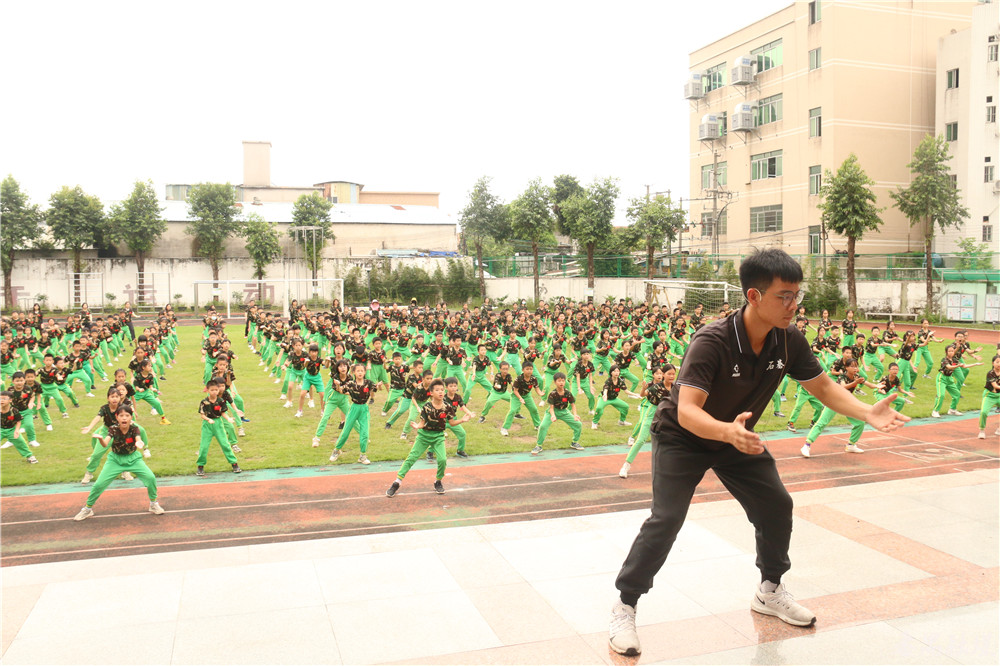 如何更好让非遗进入课堂、让孩子们从小播种下非遗的种子增强爱乡爱国情怀是一门很深的学问。为此,在学校领导和新桥村醒狮师傅的大力支持下,邢灿峰和同事们努力开发醒狮校本课程,编写了新桥小学《少儿醒狮操》读物,努力打造学校醒狮特色项目。醒狮操由传统醒狮基本动作演化而来,其基本的步法如马步、插步、麒麟步与手法融合日常体育锻炼的开合跳、弓步跳、小碎步、后踢腿等动作,通过进一步的构思编排而成。学校将此操引入大课间活动,该操分解动作以及全套动作还配有二维码视频,方便学生在家进行观看与练习。每逢大课间活动时,新桥小学全体师生跟着广播的口令,在领操员的带领下做着醒狮操,高狮动作、低狮动作、抛狮动作均做得有板有眼,极富韵律和动感。