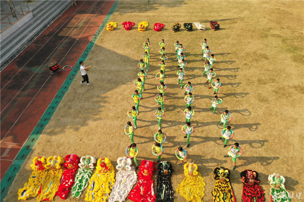 每逢周三、四、五的下午4点40分至5点40分,在九成书院,就可以见到精神抖擞的新桥小学醒狮小子在邢灿峰和新桥村醒狮师傅的指点下,伴着铿锵的鼓点,迈着遒劲的“武”步,练习武术醒狮的情景,可谓一招一式如“狮”生威,一腾一挪威风凛凛,让人深深感受到醒狮这项非遗艺术的魅力。新桥小学醒狮团由成立时的15人发展到现有成员50余人,主要由该校各年级里热爱武术醒狮的学生组成,男女生均有,能吃苦有毅力的同学都可申请加入醒狮团,经考核审查,即可成为团员。