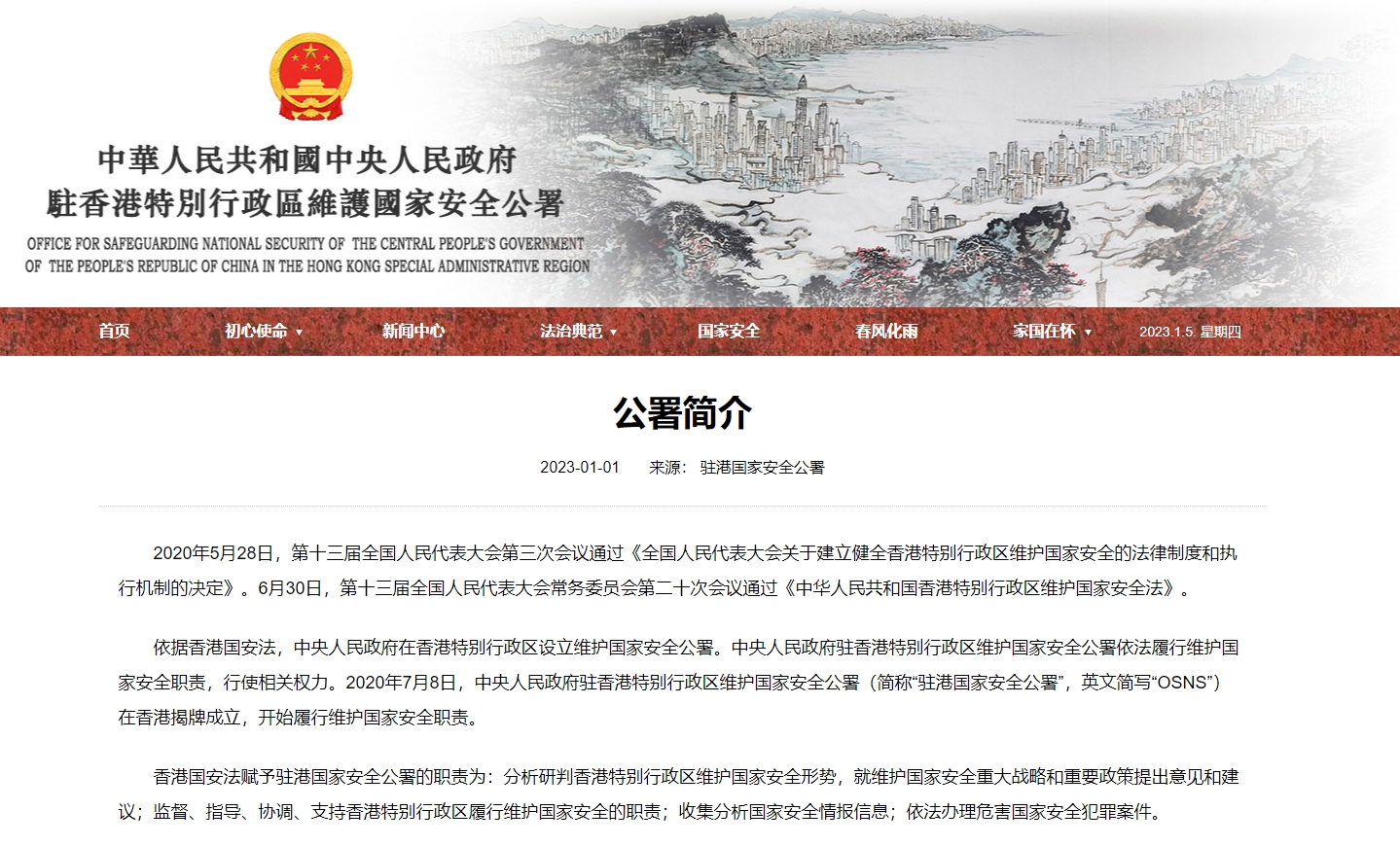 據新華社香港電 中央人民政府駐香港特別行政區維護國家安全公署官方網站1月1日正式上線試運行,網址為www.osns.gov.cn。官方微信公眾號「駐港國家安全公署」也同步開通。