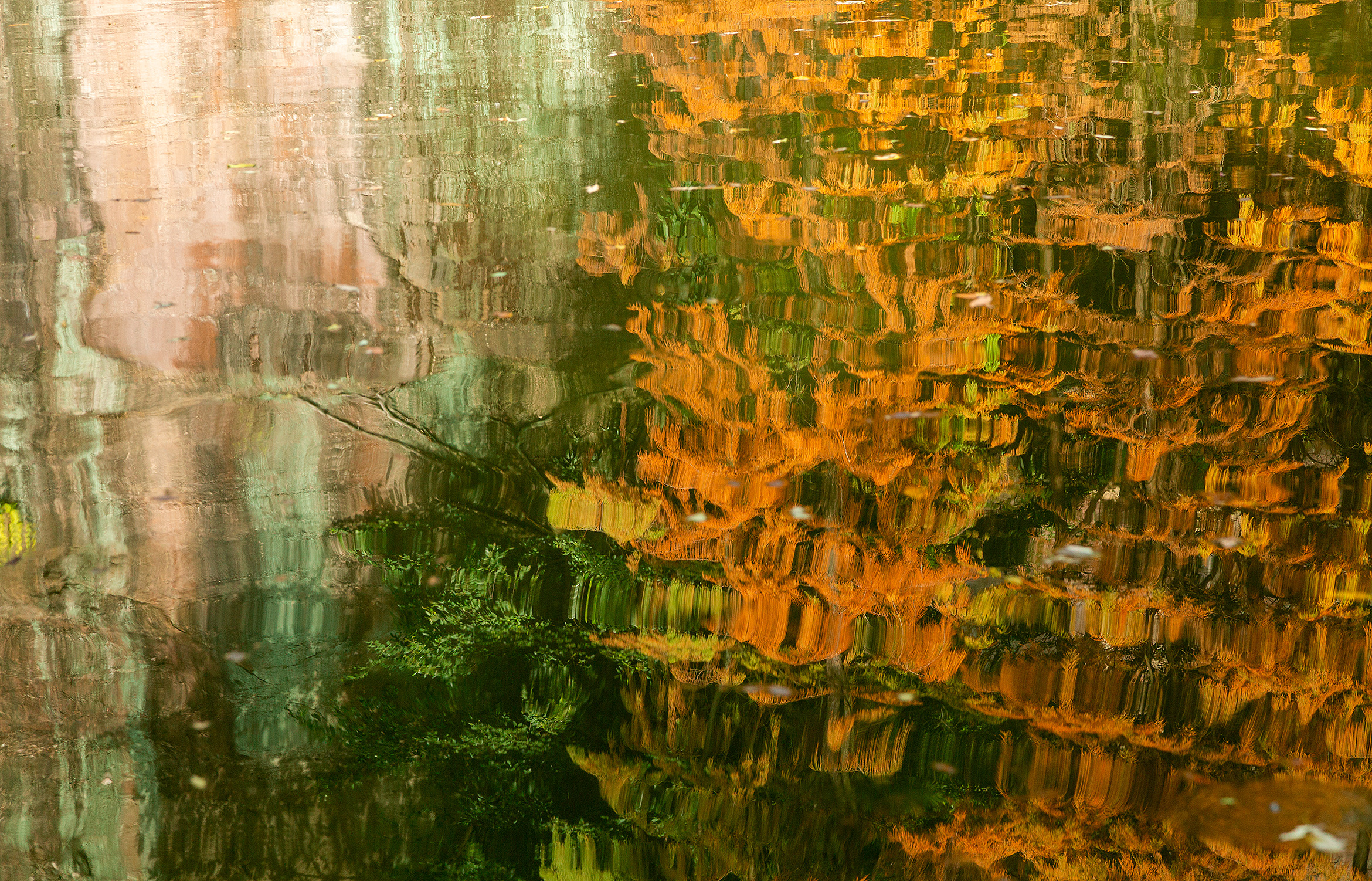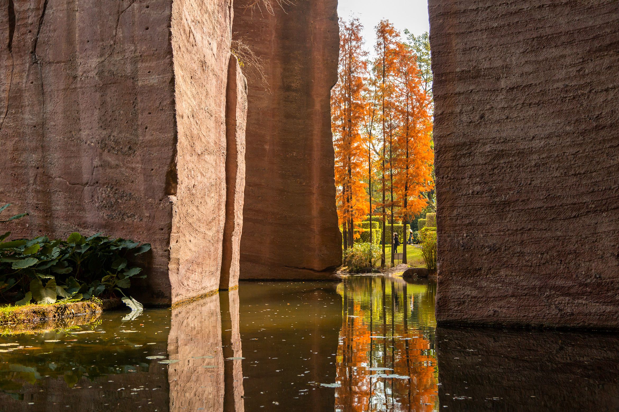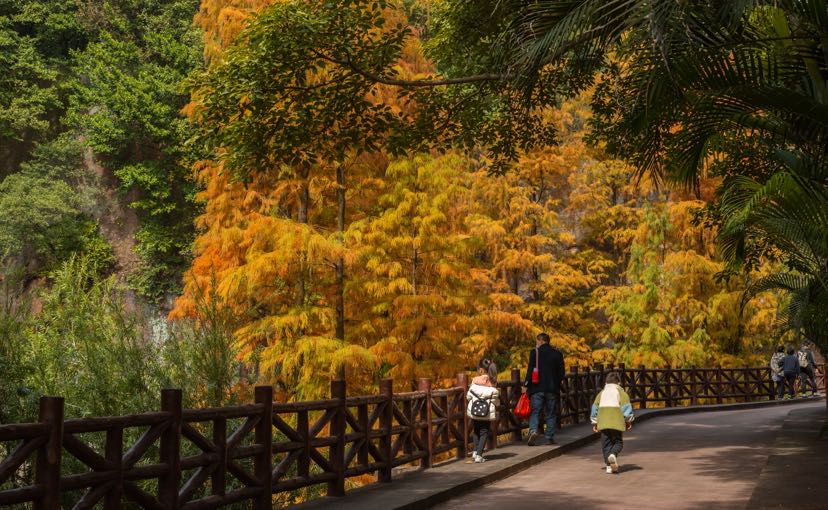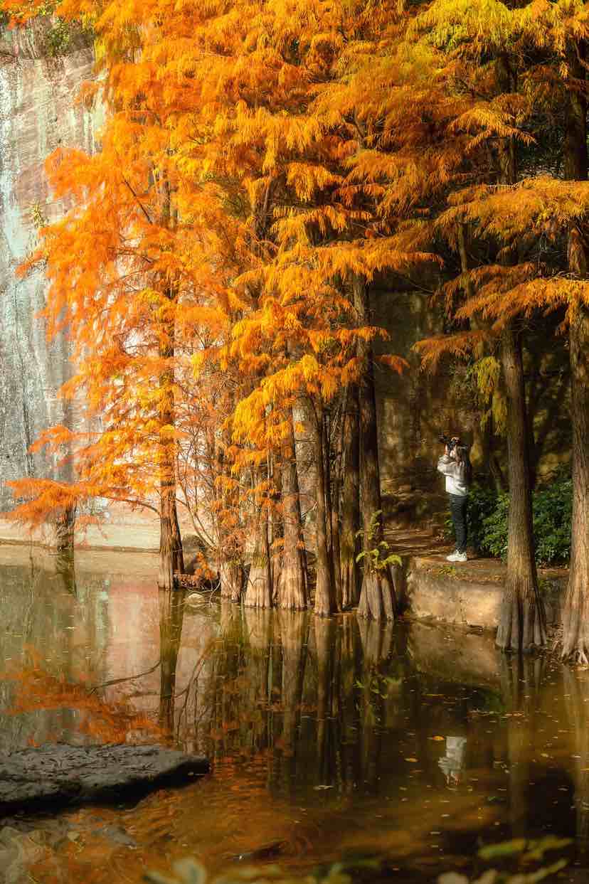 莲花山古采石场遗址深处,池杉盛装出席,以斑斓的色彩映着古老的红砂岩。燕子岩下、浴仙池旁,笔直高耸的池杉静静立在巨石间,色彩艳丽、层次分明,在阳光下,如油画般绚烂,让人流连忘返。