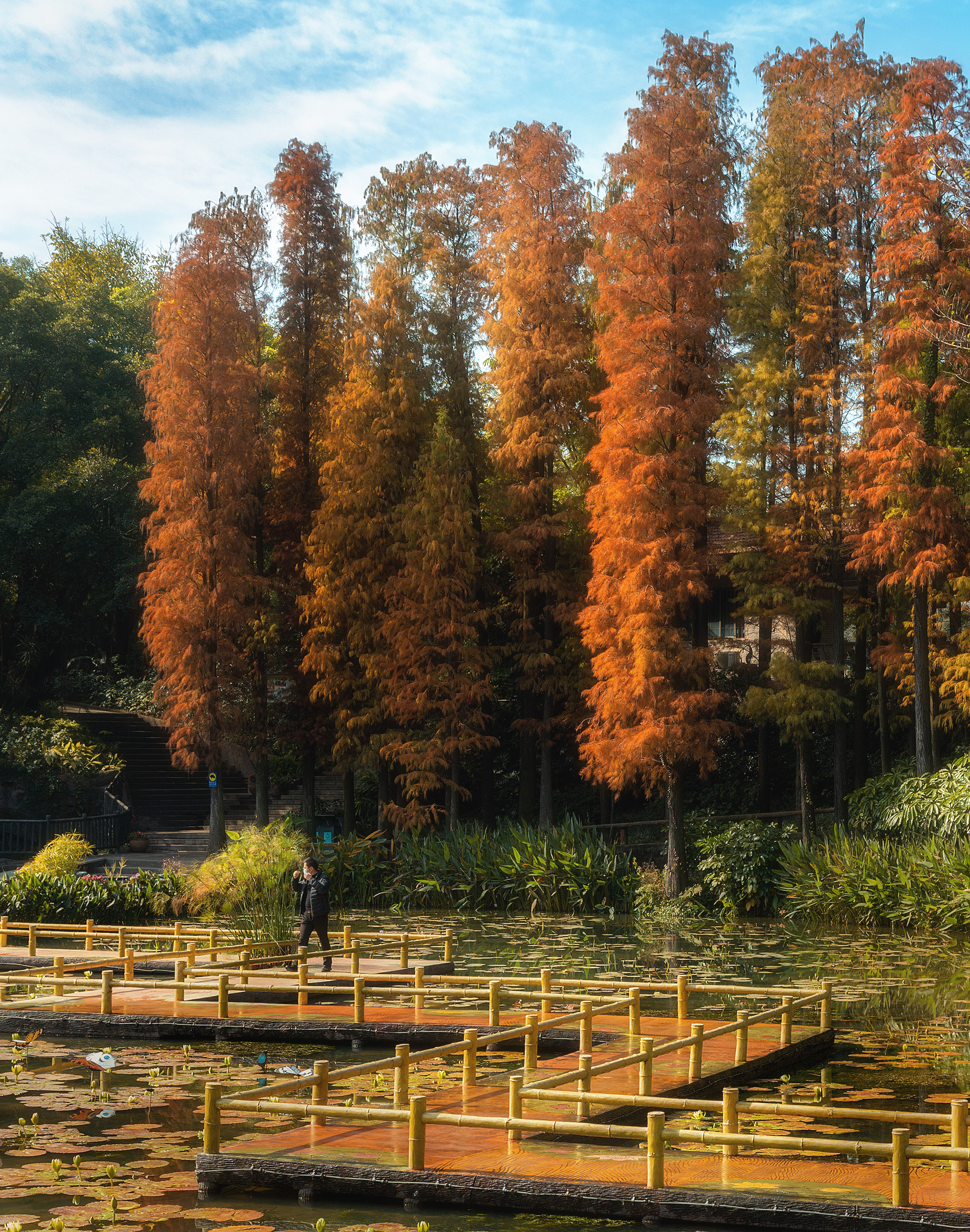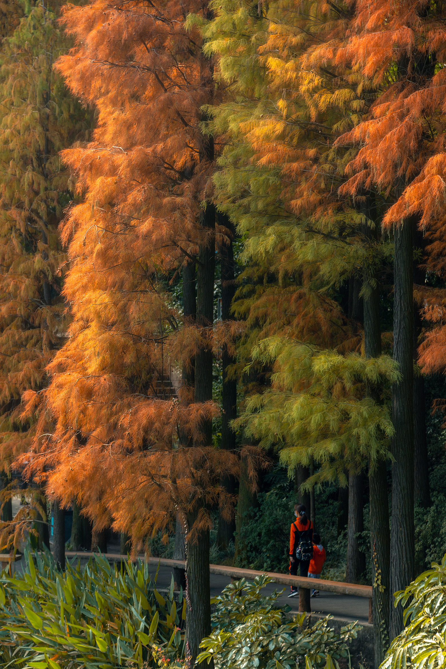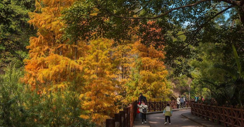 莲花山东门的池杉则带着几分旖旎,它们站立在一片绿意中,微风轻拂,红橙相间的落羽纷飞,片片池杉轻缀湖面,晕染出绝美冬色。