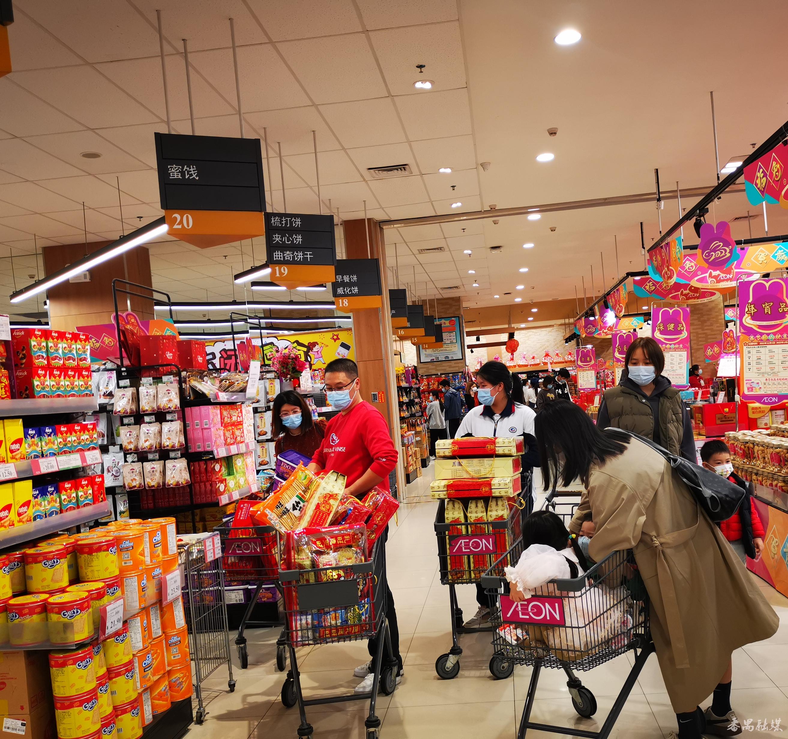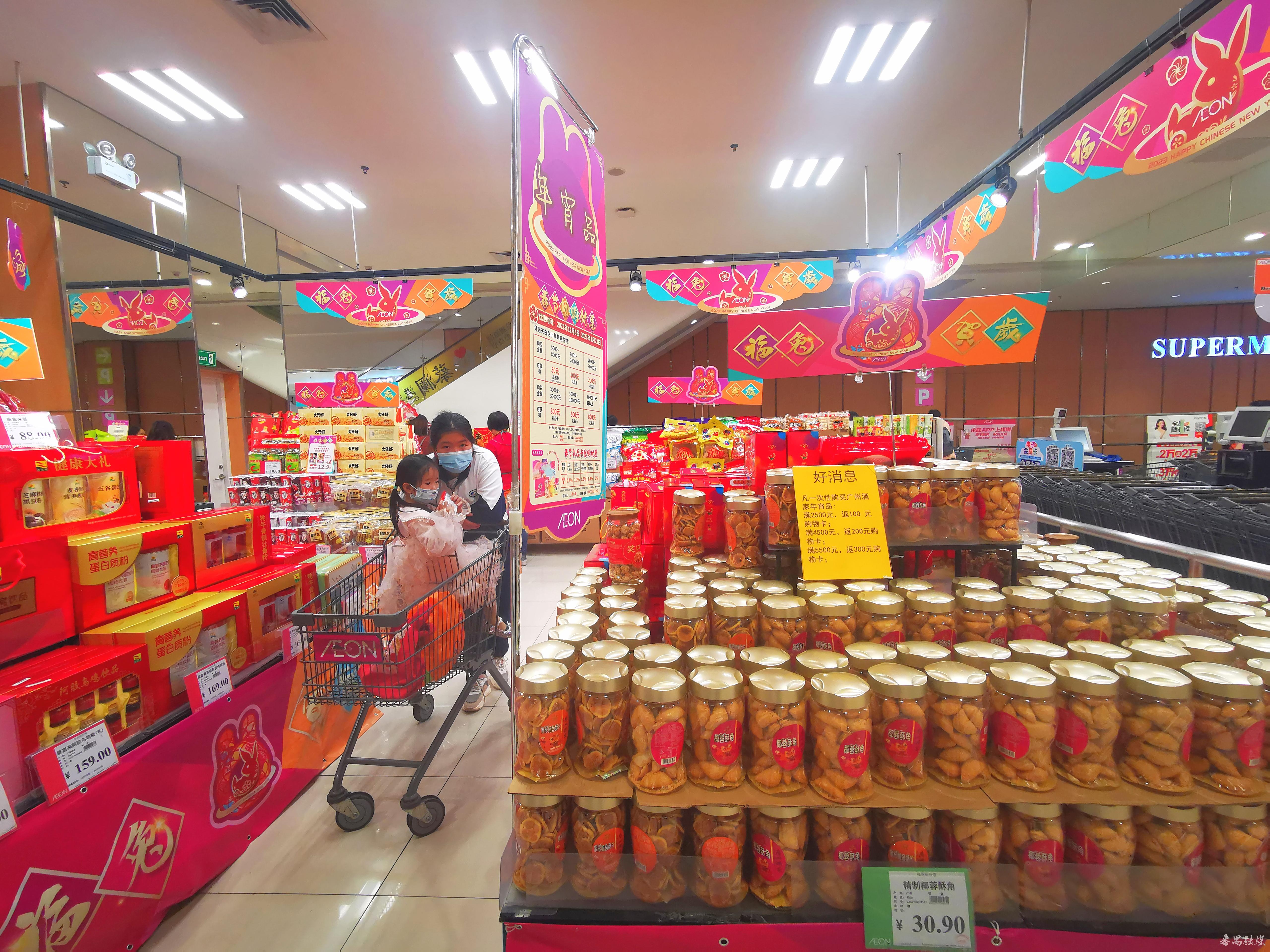 春节临近,市桥街西区综合市场、大龙街永旺梦乐城番禺广场店也一天比一天热闹。西区综合市场人来人往,络绎不绝,恢复了往日的“烟火气”,蔬菜区、水产区、熟食区、家禽区、猪肉区等分类排布,商品充足、种类丰富,还新增了一些售卖春联、灯笼、腊味、煎堆等富有年味的档口;在梦乐城番禺广场店的超市,随处可见“福兔贺岁”的年画及年宵品海报,包装精美的节日礼品盒摆在抢眼的位置,顾客推着购物车等,逐一挑选自己喜爱的礼品盒和日常生活用品。据售货员介绍,这几天年货的销售量一天比一天增多。