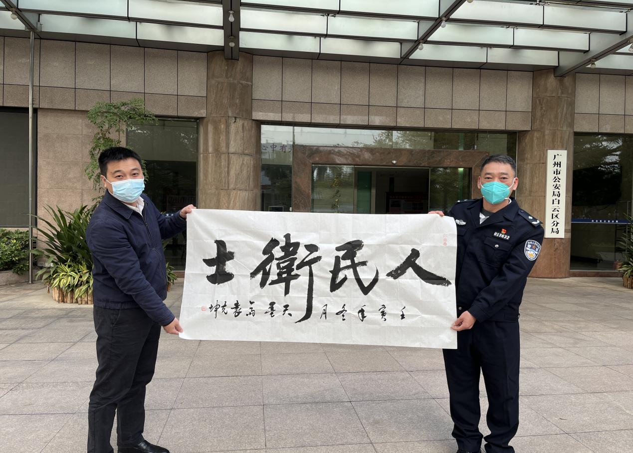 图:京溪街禁毒协会向区禁毒大队杨利勇大队长捐赠书法作品《人民卫士》