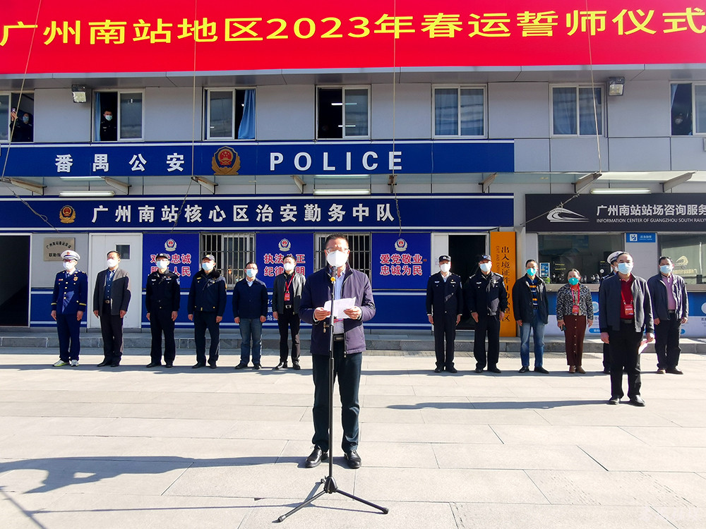 2023年春运从1月7日开始至2月15日结束。1月7日,为期40天的春运正式拉开大幕。作为珠三角地区的春运主战场,为做好2023年春运工作,广州南站地区管委会当天举行2023年春运誓师活动,全力确保广州南站春运平安有序。记者了解到,春运期间,广州南站核心区各单位一线单位共投入保障力量2400多人,实时在岗约600人。广州市番禺区2023年春节客运指挥部总指挥、副区长郭洪杰,番禺区春运指挥部成员单位参加了活动。
