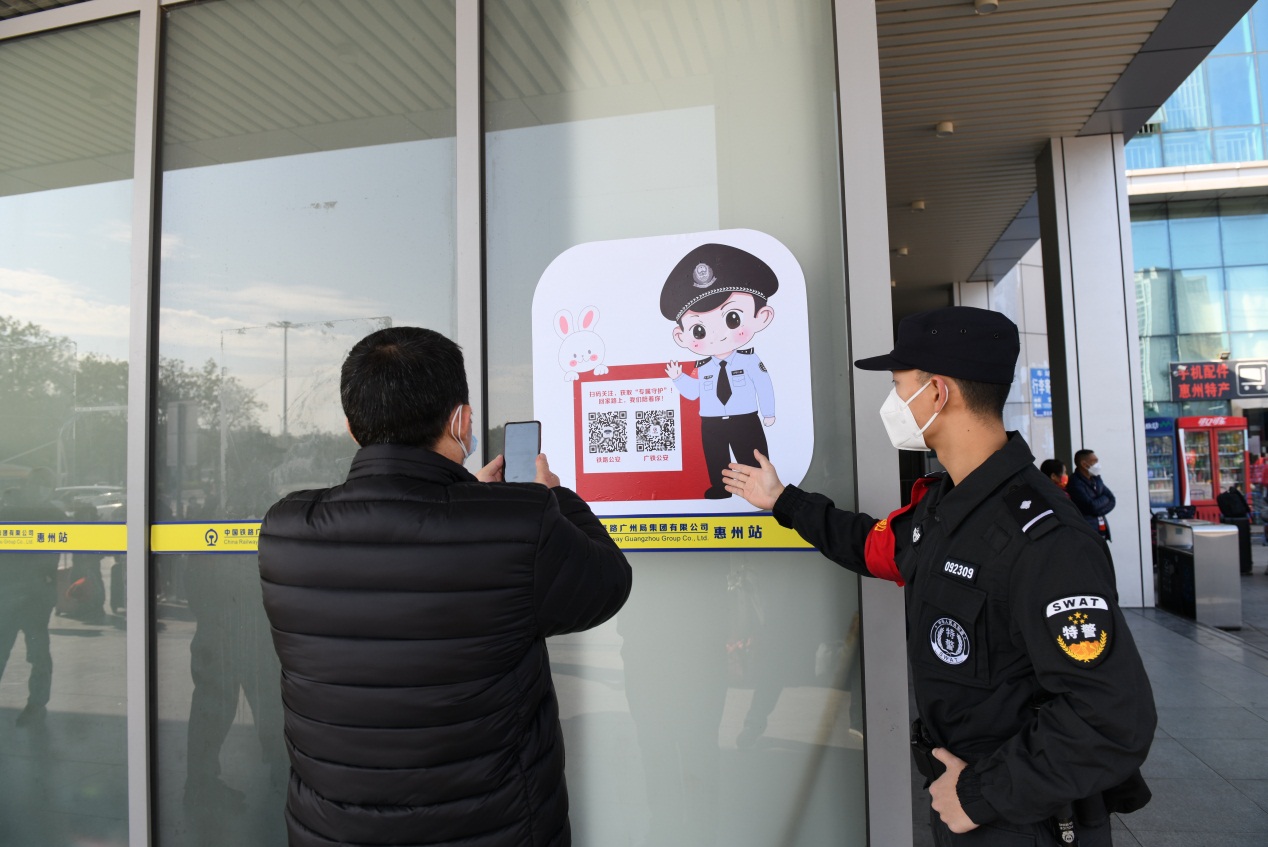 “旅客朋友们,欢迎大家扫码关注我们铁路警方二维码,给您回家旅途提供专属守护!”自“护航春运”模式开启后,广州铁路公安局惠州公安处广大值勤民警在管内沿线各车站温馨提示进站旅客。