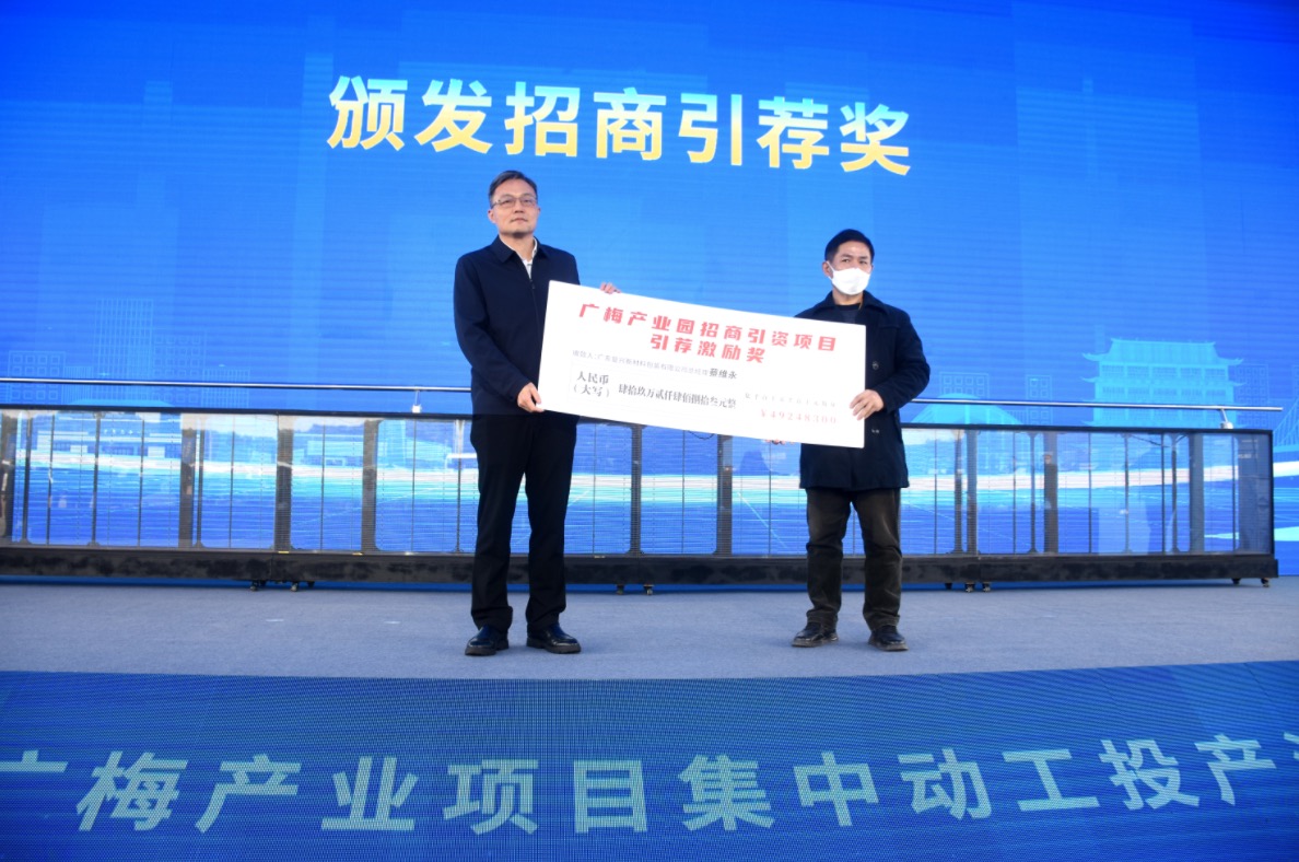 活动中,蒋鲲为广东复兴新材料包装有限公司总经理蔡维永颁发招商引荐奖励约49万元。据悉,2022年广梅园坚持以项目为王,以现代思维抓招商,新出台全员招商奖励办法,掀起了大招商、招大商、招好商的热潮。广东复兴新材料包装有限公司蔡维永总经理积极牵线搭桥,引进潮汕预制菜龙头企业——广东蓬盛味业有限公司,成为园区享受招商引荐奖励第一人。