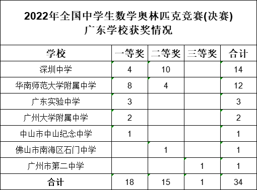 据记者整理,广东学校获奖情况方面,深圳中学学生取得4金10银,华附学生取得8金4银,省实学生取得3金,广附学生取得2金,中山纪念中学学生取得1金,石门中学学生取得1银,二中学生取得1铜。此外,广东共有5名学生进入数学国家集训队,3人来自华附,2人来自深中。这5名同学获得直接保送清北的资格。