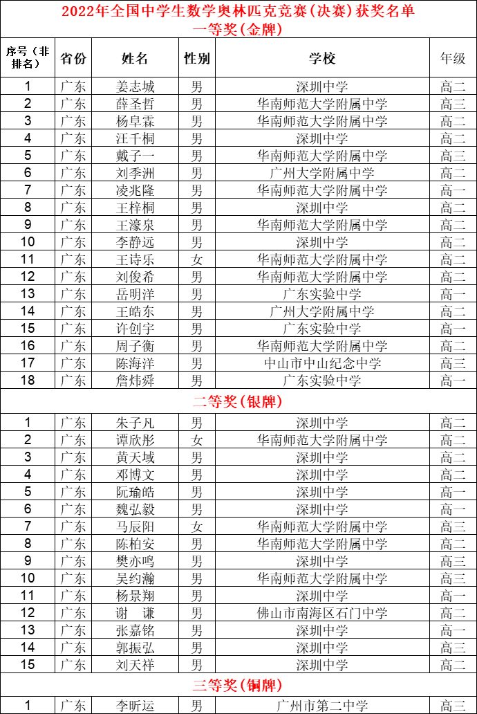 本次竞赛中,广东共34名学生获奖,取得18金15银1铜的成绩。具体获奖名单如下: