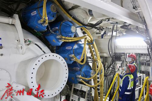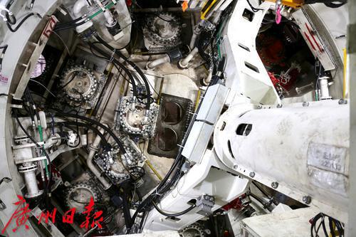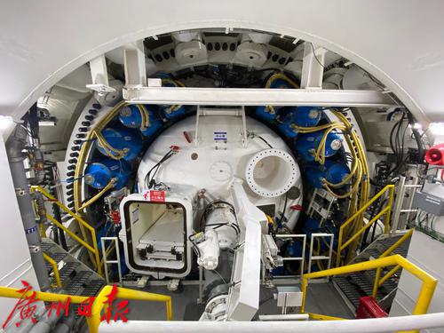 “大道先锋号”全长140米,由刀盘、盾体、桥架、拼装机和五节台车组成,开挖直径达15.07米,总重约4000吨,配置了可常压开仓换刀的复合刀盘,刀盘开口率为30%,总重(含刀具)536吨,含有212把刮刀,40把滚刀和36把撕裂刀,还配有可伸缩性主驱动、超前地质探测、高精度气液平衡、同步注射双液浆、盾尾间隙自动测量等一系列智能化系统,在设备选型上为盾构机长距离穿越珠江三角洲地区上软下硬的复杂红层地质做足了前期准备,实现了“量身定制”。