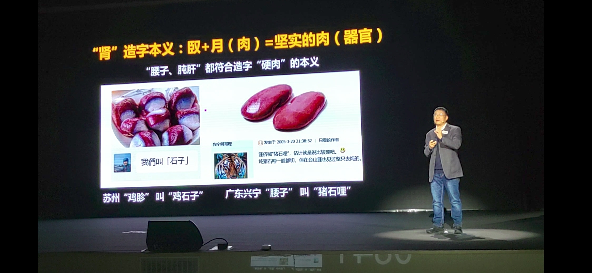在广东,人们把鸡胗喊作 “鸡肾”,但鸡胃和鸡肾是两个不同的器官,广东人是搞错了吗?严修鸿从汉字的声符出发找答案。他说,汉字百分之七八十都是形声字,形声字中的声符是有含义的。例如从“青”得声,多有“美好”意,如情、晴、精;从“可”得声,多有“大”意,如河、荷、柯;从“枼”得声,多有“薄”意,如蝶、碟、牒。“肾”的偏旁“臤”也有“坚实”的含义,由于鸡胗肉偏硬,由于鸡胗肉偏硬,所以把“鸡胗”叫做“鸡肾”,音义上是完全有理据的。