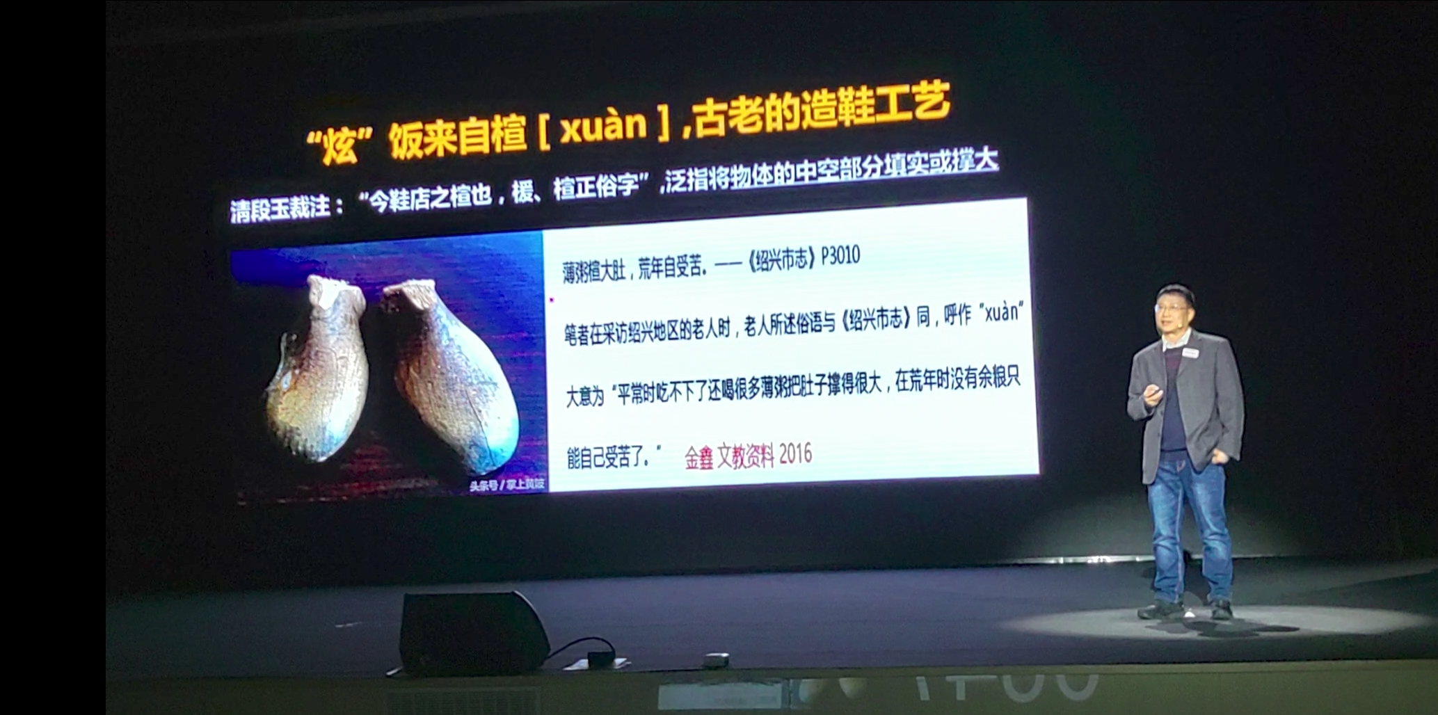 年轻人对“炫饭”这个网络热词再熟悉不过了。严修鸿说道,“炫饭”来自东北话,其实是一个带有贬义的词语,经常出现在争吵的时候,指夸张的吃饭方式。考据发现,“炫”的本字应为做鞋工艺中的“楦”。鞋匠会用“楦头”把鞋子撑开,因此“楦”的引申意为把东西狠狠地填进去。在绍兴,流传着“薄粥楦大肚,荒年自受苦”这句俗语,意为“在平常日子明明吃不下还喝很多粥把肚子撑大,到荒年时没有余粮只能自己受苦了”。