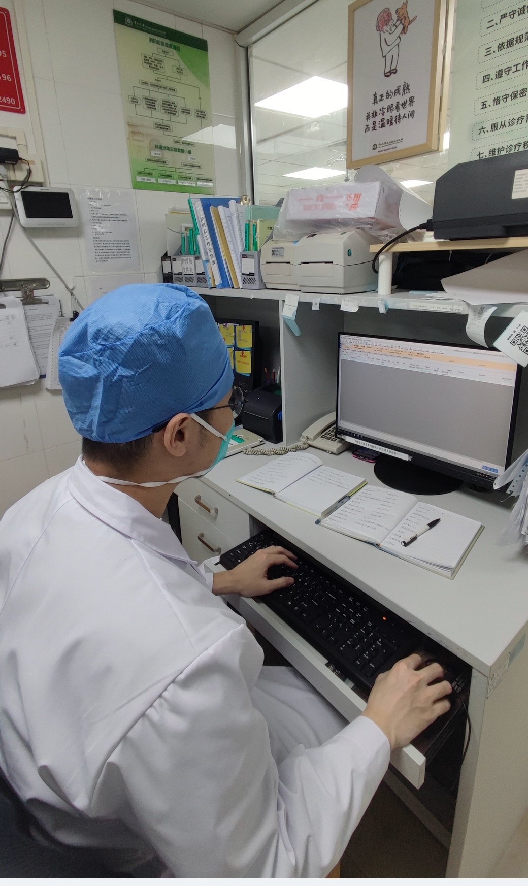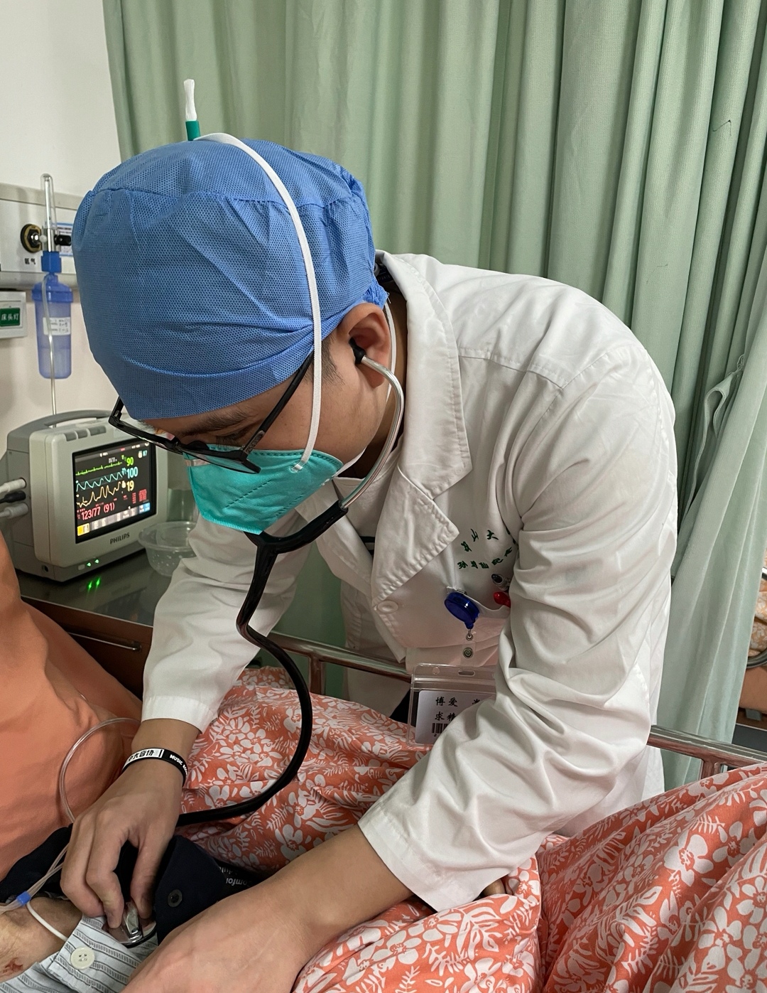 一名90岁的老人新冠感染合并慢性阻塞性肺疾病,入院时血氧饱和度还不足80,因明显气促无法平躺。正在呼吸科轮科的临床医学(消化系病方向)研究生郭泰然(见下图)在上级医生的指导下,承担起管床的责任,直至老人平安出院。“出院时老人一直对我说谢谢,让我很感动。”