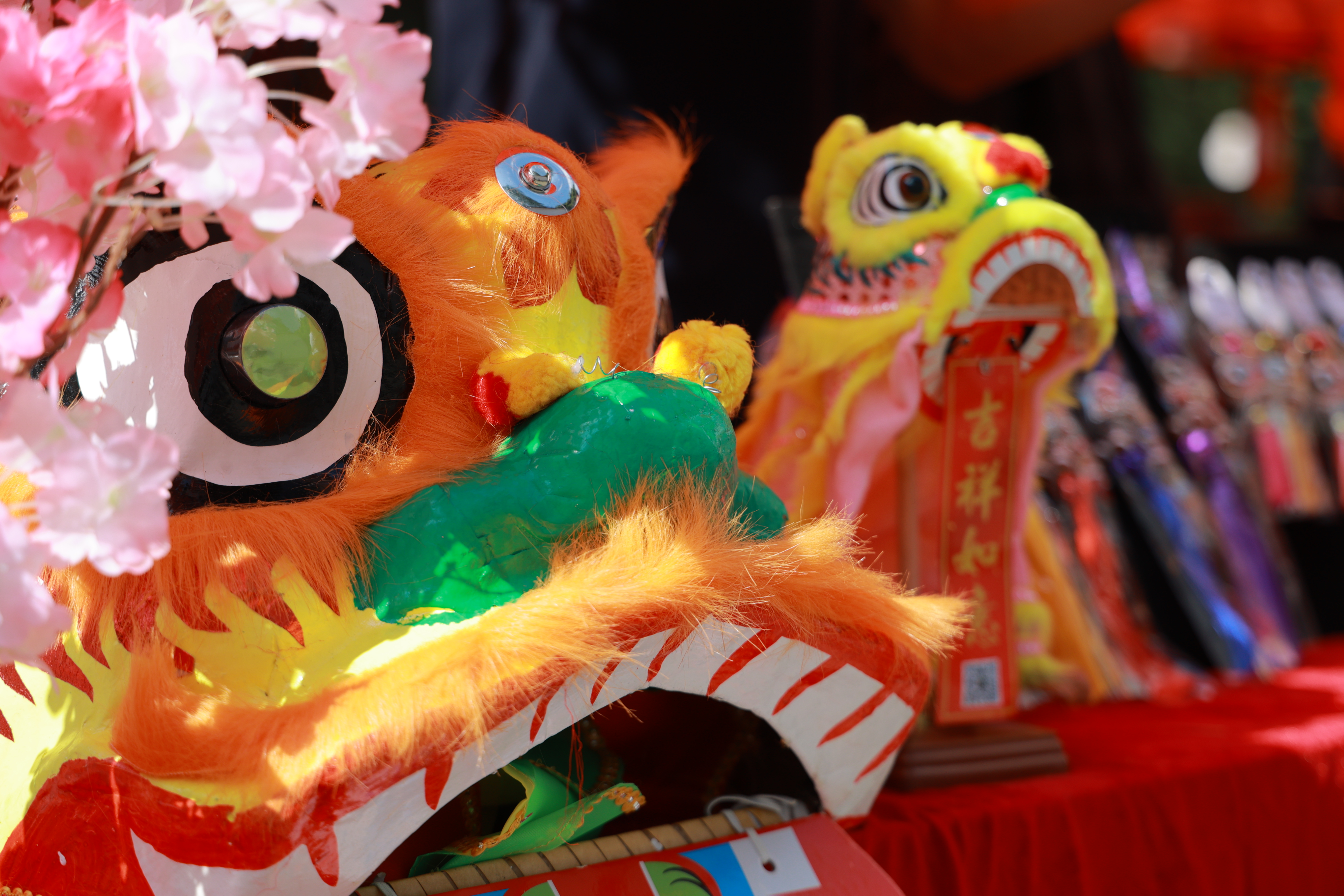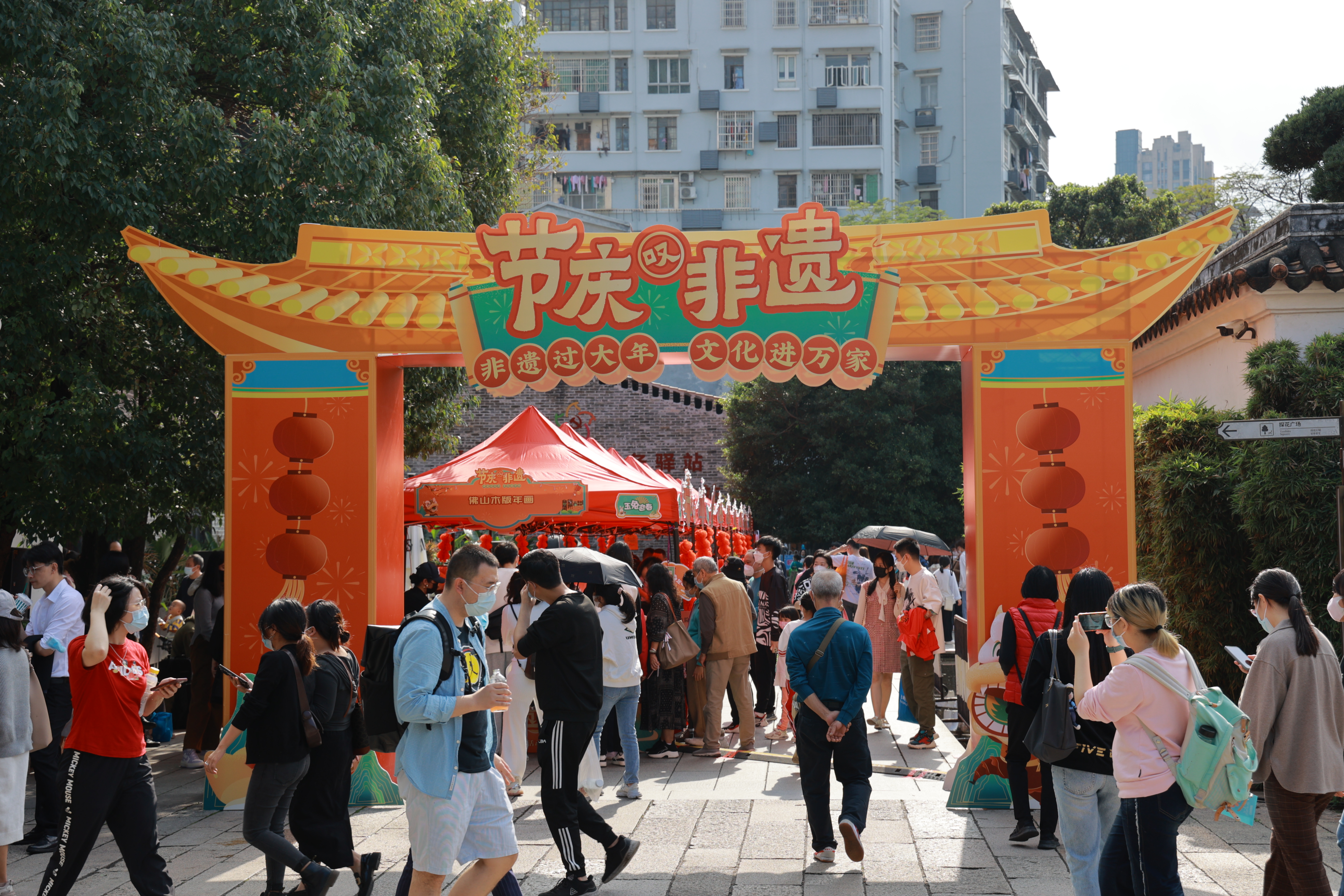现场,一顶顶红色帐篷下,广绣广彩、醒狮、木版年画、剪纸、彩灯,用最岭南的符号元素妆点着人们的视线,目之所及,年味浓浓。