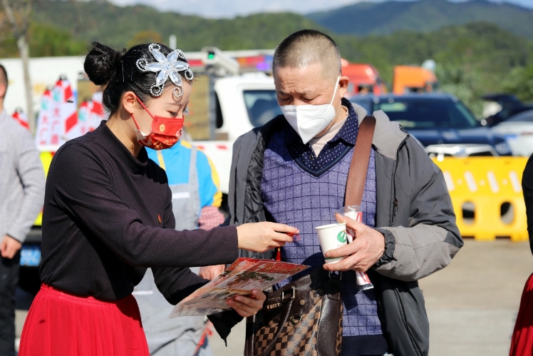 在现场,志愿者们一边为司乘人员送上暖心姜茶与新春祝福,贴心地为其答疑解惑,免费提供口罩、应急药品,一边提醒司乘在行车途中注意安全。交警和路政人员则联合在服务区开展路网知识普及、防疫防控知识及交通安全宣传。