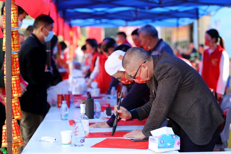 活动现场,红火喜庆的新年展板,热闹欢腾的志愿摊位,挥毫创作的书法家,穿梭于车辆间指引交通的“红马甲”,充满着浓浓年味的醒狮表演,吕田服务区洋溢着节日喜庆氛围。