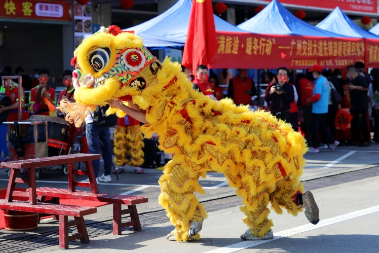 “回家乡的路上经过这里,被舞狮表演吸引过来了,喝了一杯热姜茶,还收到了春联,真的是暖胃又暖心啊!”旅客林女士满脸笑意地说道。