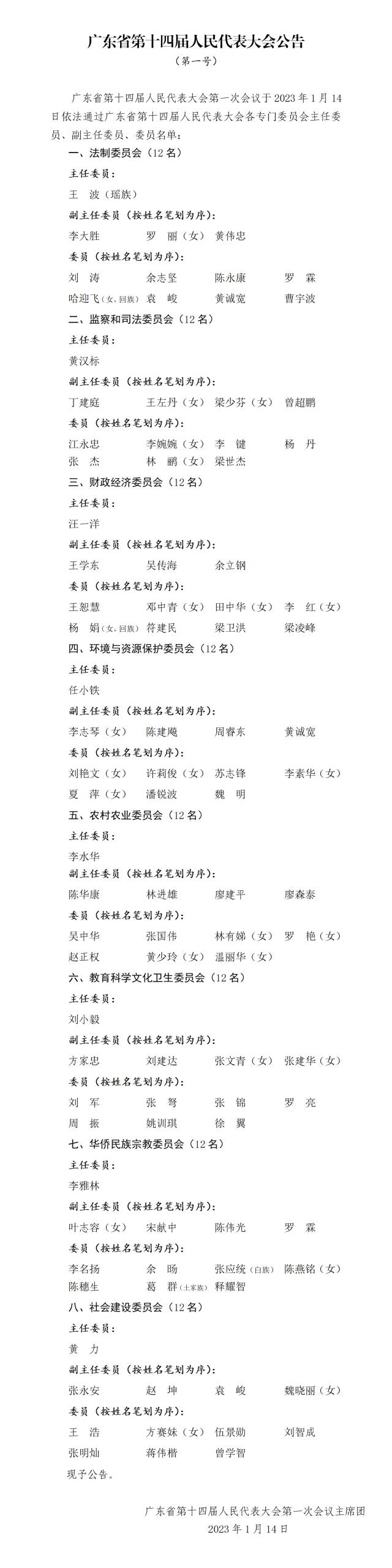1月14日,广东省十四届人大一次会议举行第二次全体会议,表决通过了广东省十四届人大各专门委员会主任委员、副主任委员、委员名单。