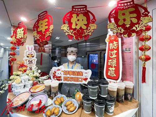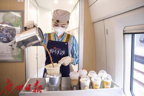 2023年1月15日,广深港高铁。广深港高铁上的餐食和其他线路有什么不同?记者从广州动车组餐饮公司了解到,针对广深港高铁旅客的偏好口味,餐食围绕粤港风味,特别上新了肉酱意大利面、虾肉馄饨面、菠萝咕噜肉拼宫保鸡丁等菜式,还有双皮奶、蓝山咖啡以及自主品牌“那个女孩”高铁奶茶。