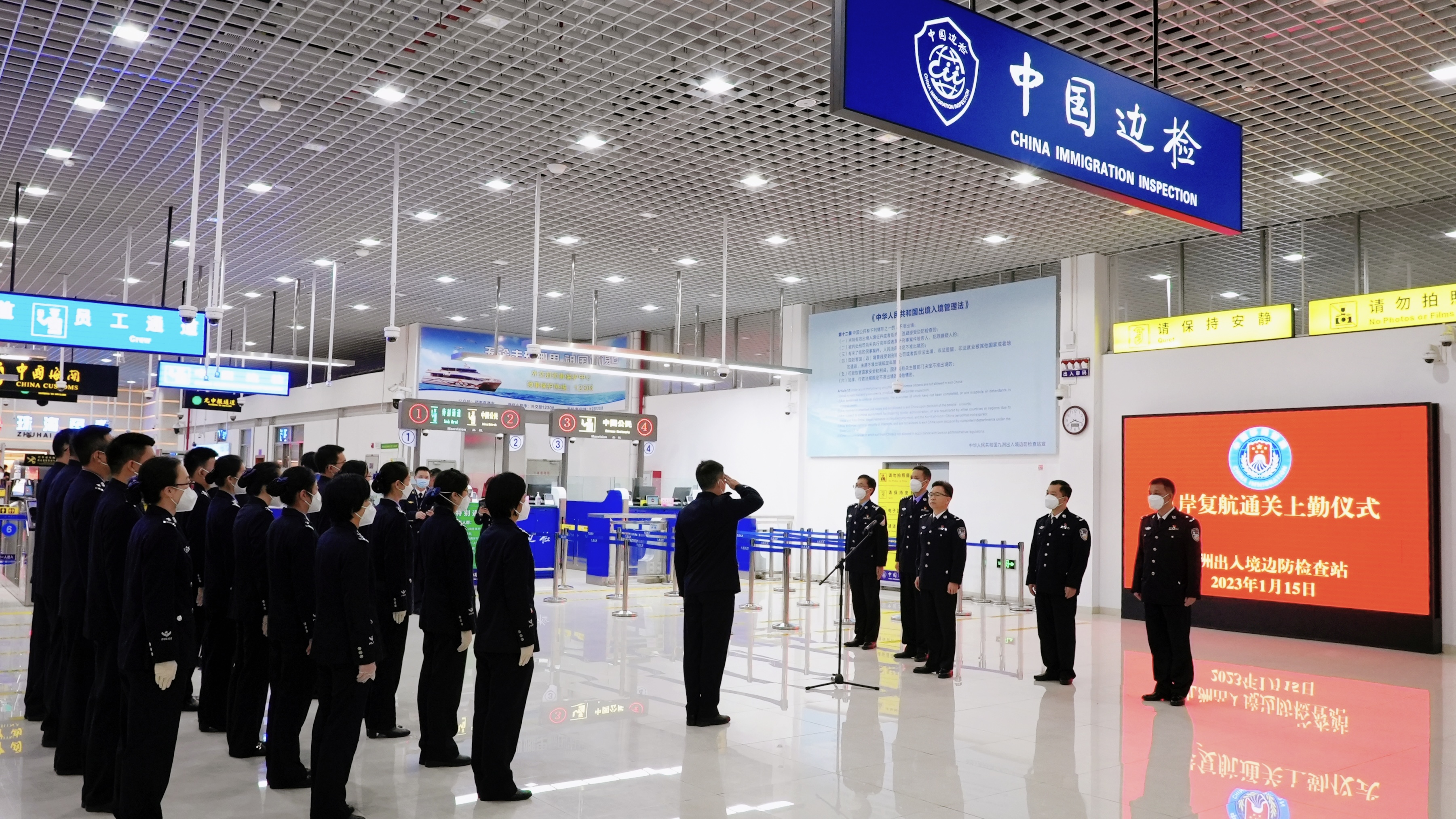 “向左向右转,上勤!”早上8时,珠海边检总站九洲边检站在口岸出境大厅举行口岸复航通关移民管理警察上勤仪式,为九洲港口岸顺利复通和即将到来的春运客流高峰做好动员部署。