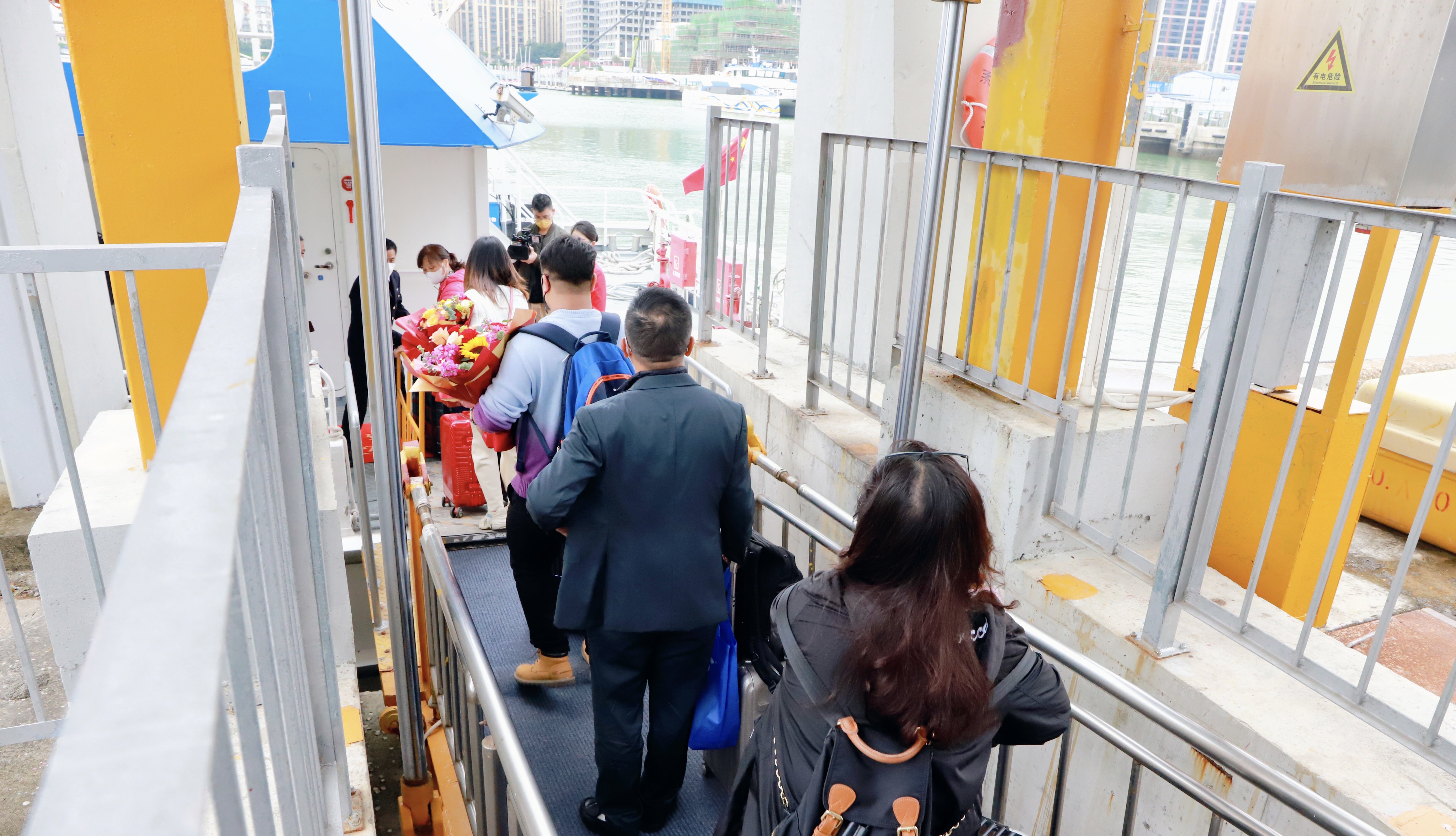 1月15日上午9时整,搭乘着31名内地旅客的“海璟”号高速客轮从九洲港客运码头出发驶往香港,标志着因疫情影响而停航闭关近3年的九洲港口岸正式恢复通关。