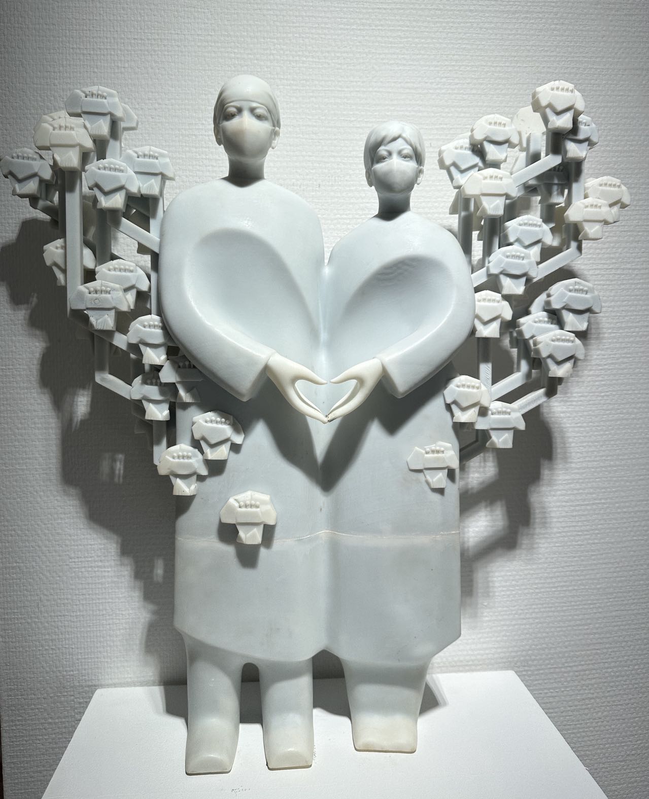 广州日报·新花城记者走访雕塑展现场看到,有的作品表现出岭南风土人情,有的作品则反映抗击疫情。玻璃钢雕塑作品《痕装》,以浮雕形式表现在抗击疫情战斗中的一位白衣女战士卸下防护装备的形象,呈现出医护人员忘我奉献的精神。据创作者卢跃飞介绍,当时他通过新闻报道看到医护人员脱下防护服时脸上有痕的照片,感到很震撼,想通过艺术的形式表现出这样的一幕。