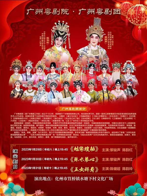 1月29日(正月初八)至1月31日(正月初十),广州粤剧团将为化州市笪桥镇水塘下村群众送去《姑缘嫂劫》《珠水琴心》《五女拜寿》三台精彩的大型剧目。