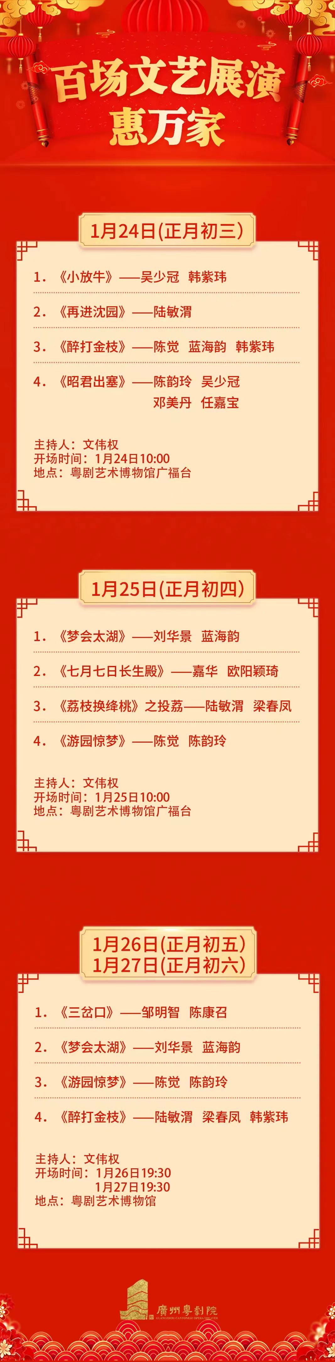 1月24日(正月初三)至1月27日(正月初六),广州粤剧团受邀为“百场文艺展演惠万家”活动演出四场折子戏专场。届时,广州粤剧团多位唱念做打俱佳的演员们将轮番上阵,为观众献演《昭君出塞》《再进沈园》《游园惊梦》《三岔口》等多个经典折子戏,令市民和游客能在喜庆祥和的春节氛围中,近距离欣赏“南国红豆”的艺术魅力。