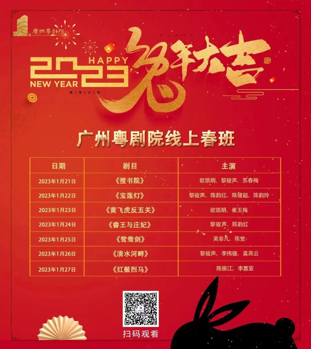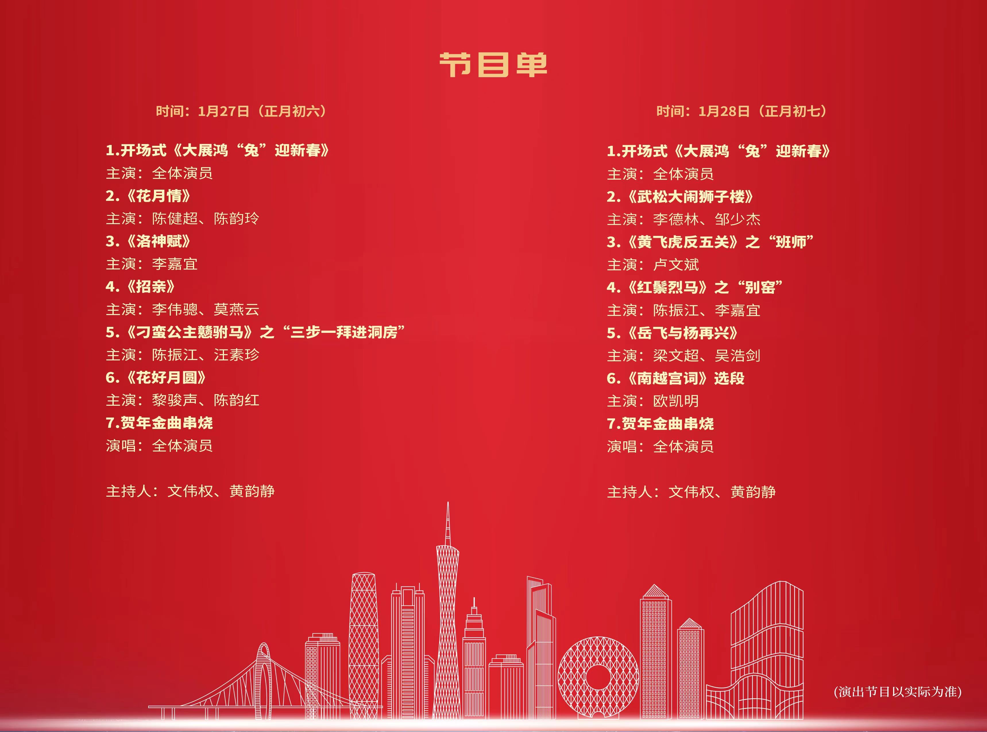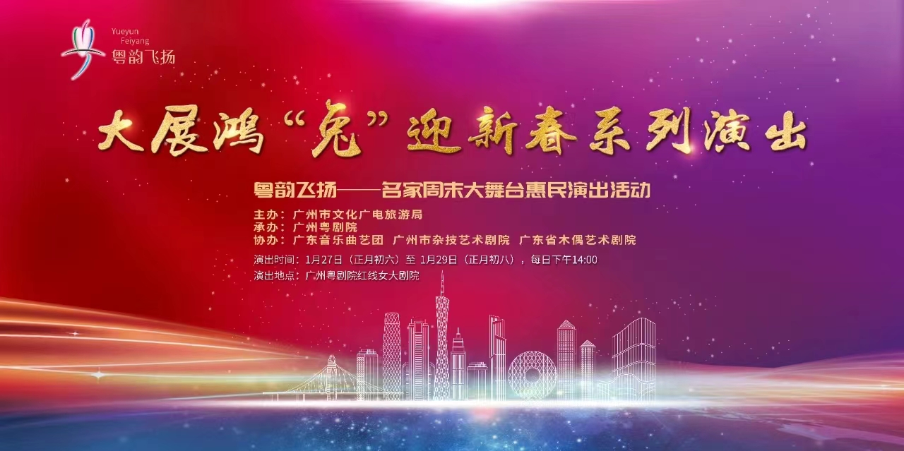据悉,本次三场《大展鸿“兔”迎新春系列演出》以恭贺新春为主题,由欧凯明、黎骏声、陈韵红、吴非凡等粤剧名家领衔,广州粤剧院、广东音乐曲艺团、广东省木偶艺术剧院、广州市杂技艺术剧院等市属国有文艺院团联袂演出,以精彩纷呈的文艺盛宴为广大市民送上新春祝福,同时营造喜庆祥和的节日氛围。