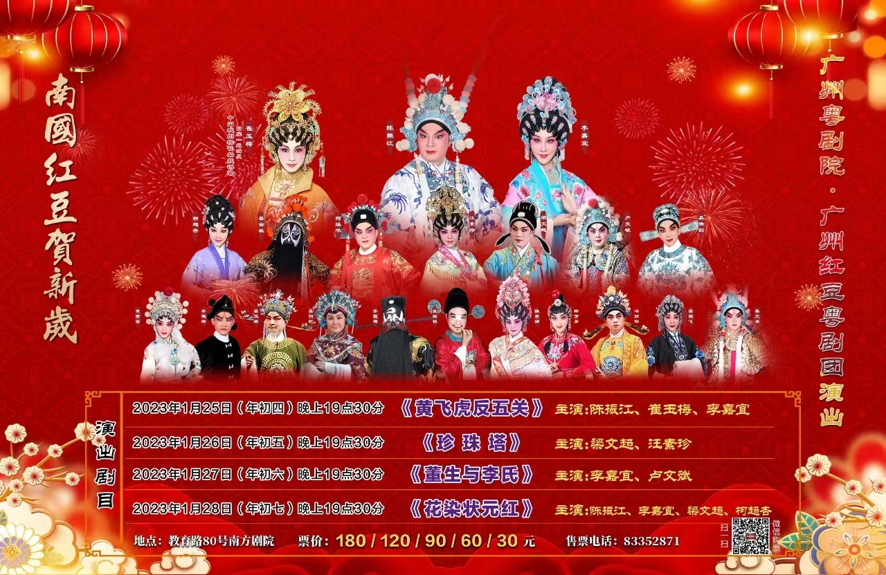 自1月25日(正月初四)起,至1月28日(正月初七),一连四日,广州红豆粤剧团将先后上演四部风格各异的大型剧目,既有经典的传统粤剧《黄飞虎反五关》《花染状元红》,又有经典的移植剧目《珍珠塔》《董生与李氏》。无论是场面火爆的武戏,还是情感动人的文戏,都将令羊城观众过足戏瘾。