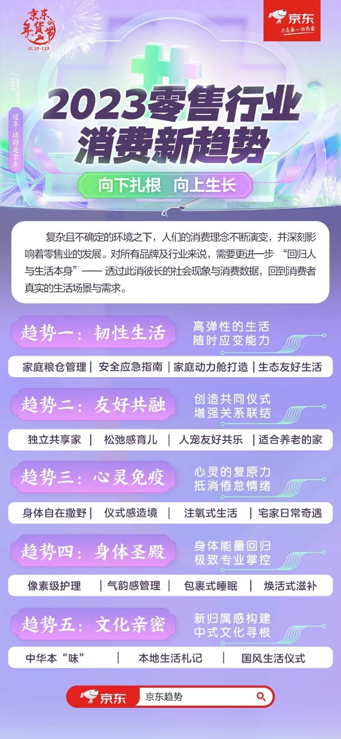 春节临近,大家明显的感受是:烟火气开始回来了。在“稳增长促消费”政策支持下,疫情3年以来,全国人均可支配收入情况仍处于良性增长阶段,我国经济韧性凸显,消费市场螺旋式恢复,数字化消费进一步升级,长期向好的基本面没有改变。近日京东与睿丛咨询联合发布的《2023年零售行业消费新趋势》显示:疫情以来,人们对于从前的信条进行着重新的思索,在追求身体健康、心灵修复免疫、与家人朋友的亲密互动、从文化中获得滋养等方面展现出全新的消费趋势。