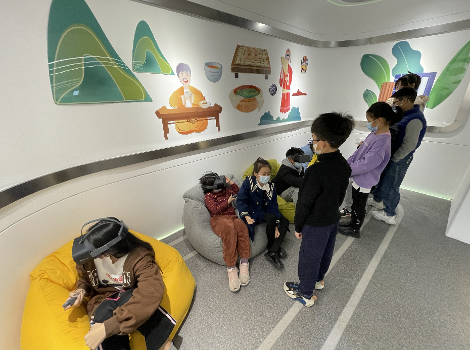 图书馆二楼还开设有沉浸式体验空间,读者戴上VR眼镜,坐在舒服的沙发上,便可开启一场“知识奇妙之旅”。此外,葵蓬馆还设有大数据智慧墙、文化E站资源机等云服务设备,向读者展示实时借阅数据信息,提供在线浏览海量数字资源等功能。