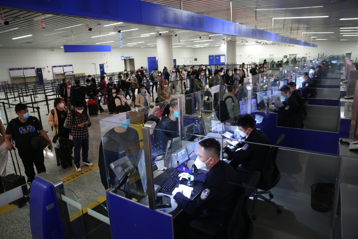 “好长时间没回国了,盼的就是过年!”带着三个小孩、拖着大件行李从新加坡回国的李女士一行,被移民管理警察陈映彤引导步入“绿色通道”后连连致谢。