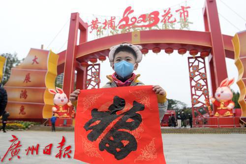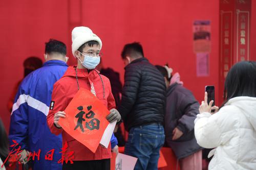 图为小朋友在花市牌坊前展示领取到的福字。