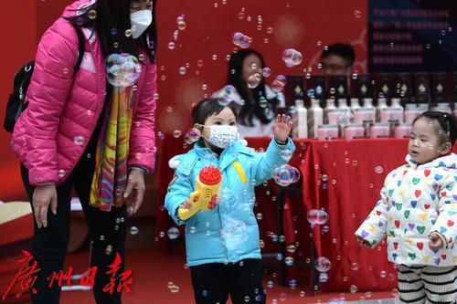 图为小朋友在花市里面吹泡泡。