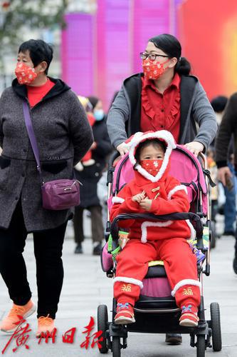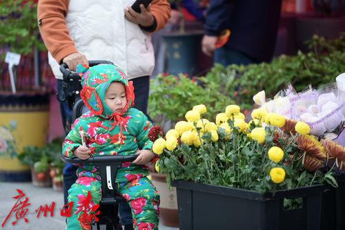 图为小朋友穿着喜庆的衣服逛花市。
