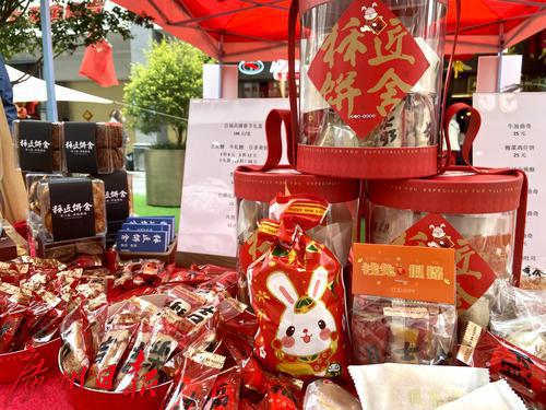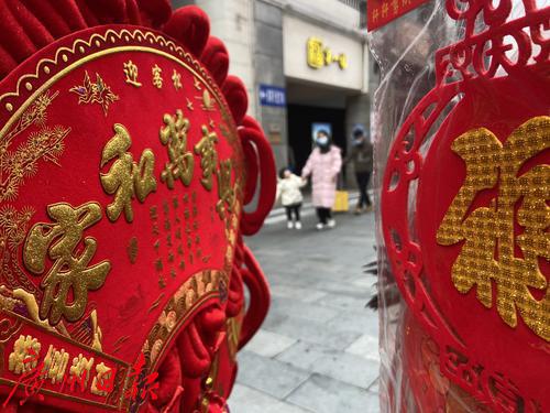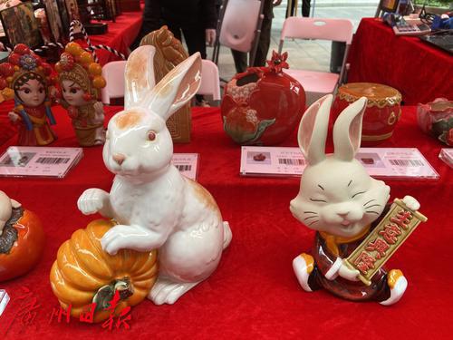 在北京路北段,一只彩色兔子塑像吸引许多市民驻足,塑像后方是一个个整齐摊位组成的花街,不仅有各式的年花春联,房车、自动驾驶公交车也“开进”花街。