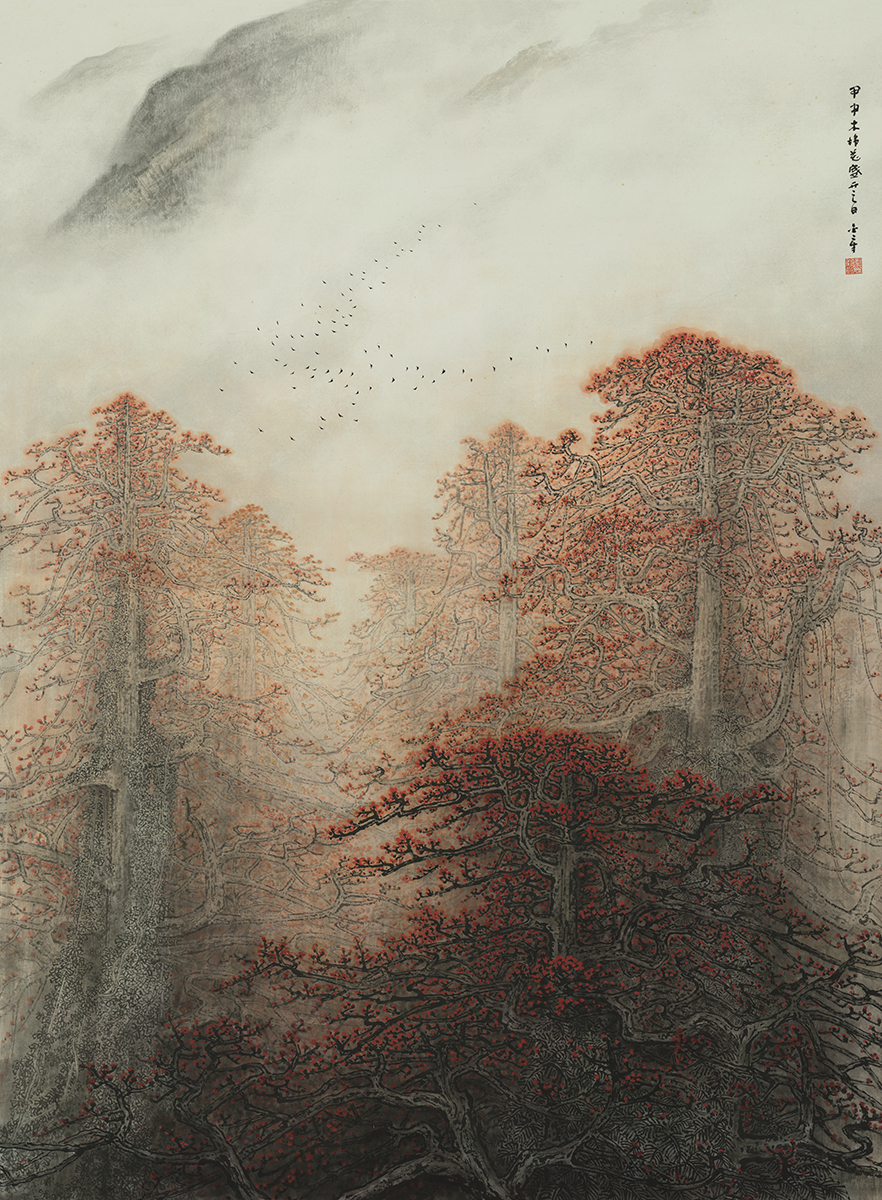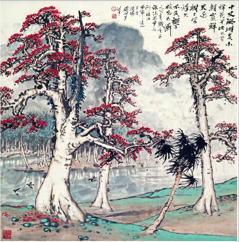 岭南画派山水画大家陈金章将传统上视为花鸟题材的木棉引入国画山水创作题材。在高剑父纪念馆馆长李琰看来,陈金章此次参展的《木棉花盛开》首先用细腻沉稳的笔墨,通过对成林红棉的描绘和润泽的晕染,营造出了一种岚雾华滋的气氛,强化了红棉的生命力,透过烟云茫茫的远山,强化了画面的纵深空间,也进一步提升了作品的境界,塑造出了一个昂然而深沉含蓄的精神世界,“因此他摆脱了对木棉花自然属性的刻画,也摆脱了传统中国画山水与花鸟分科的限制,而是通过自我的思想把其提升到了人文高度,在这里,无谓山川,无谓花木,只有一种积极的精神,一种家国的情怀。”