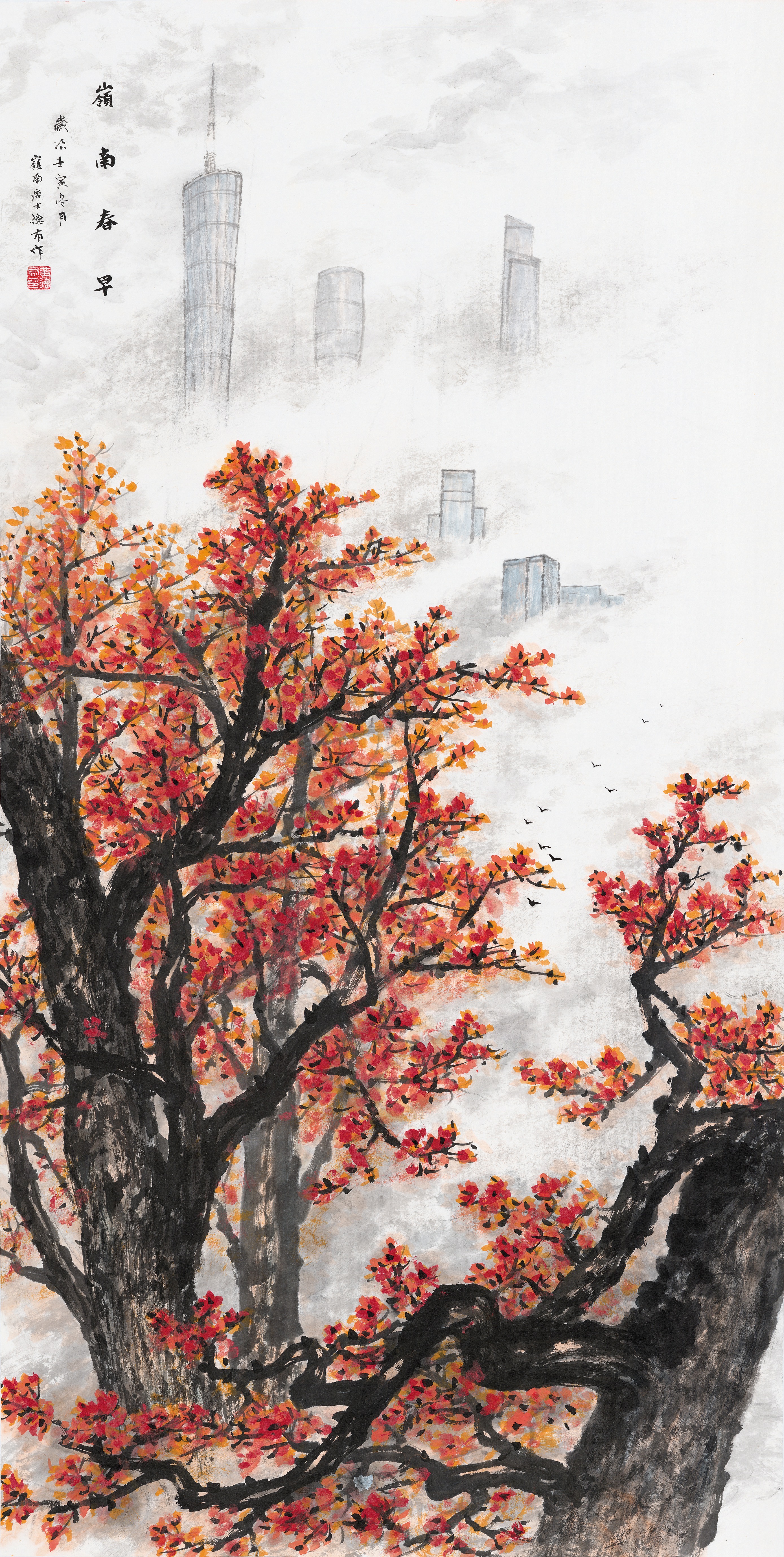 当木棉树遇见广州的地标,正是黄德有笔下《岭南春早》勾勒的场景,壮硕的木棉树,骄傲的伸出枝干,枝干墨色浑厚浓重,花朵灿烂雄艳,创造出一种荡然开合雄浑的气度,然后傲然地把观者视线牵引上扬,上扬到画幅上方云雾间若隐若现的广州地标——广州塔与双子塔。“表面看来,画面至此戛然而止,其实不然,而是意在画外,画外喻示的是在英雄精神激励下的未来,隐喻而象征地歌颂了广州。”