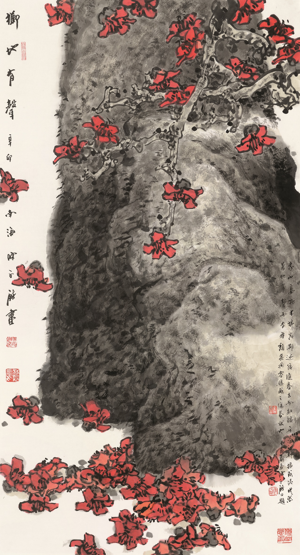 艺术家陈永锵以擅画木棉著称,其笔下的木棉,摈弃了传统花鸟画的表达程式,纵横开阖,大处求势,往往利用虬龙般的枝干,表现沧桑与厚重,以浓艳的花朵形成铿锵有力的鼓点,既舒展张狂,又有庄严崇高的庙堂风范。“陈永锵笔下的木棉虽然红艳,却似突破黑夜的闪耀怒放,充分展现出非凡生命的活力,洋溢着一种壮丽和旷世的英雄人格。我们可以说,陈永锵开创了红棉绘画新面貌,这也是对既开放包容,又有所坚守的岭南文化精神的传承,对厚重历史的高歌。”李琰说道。