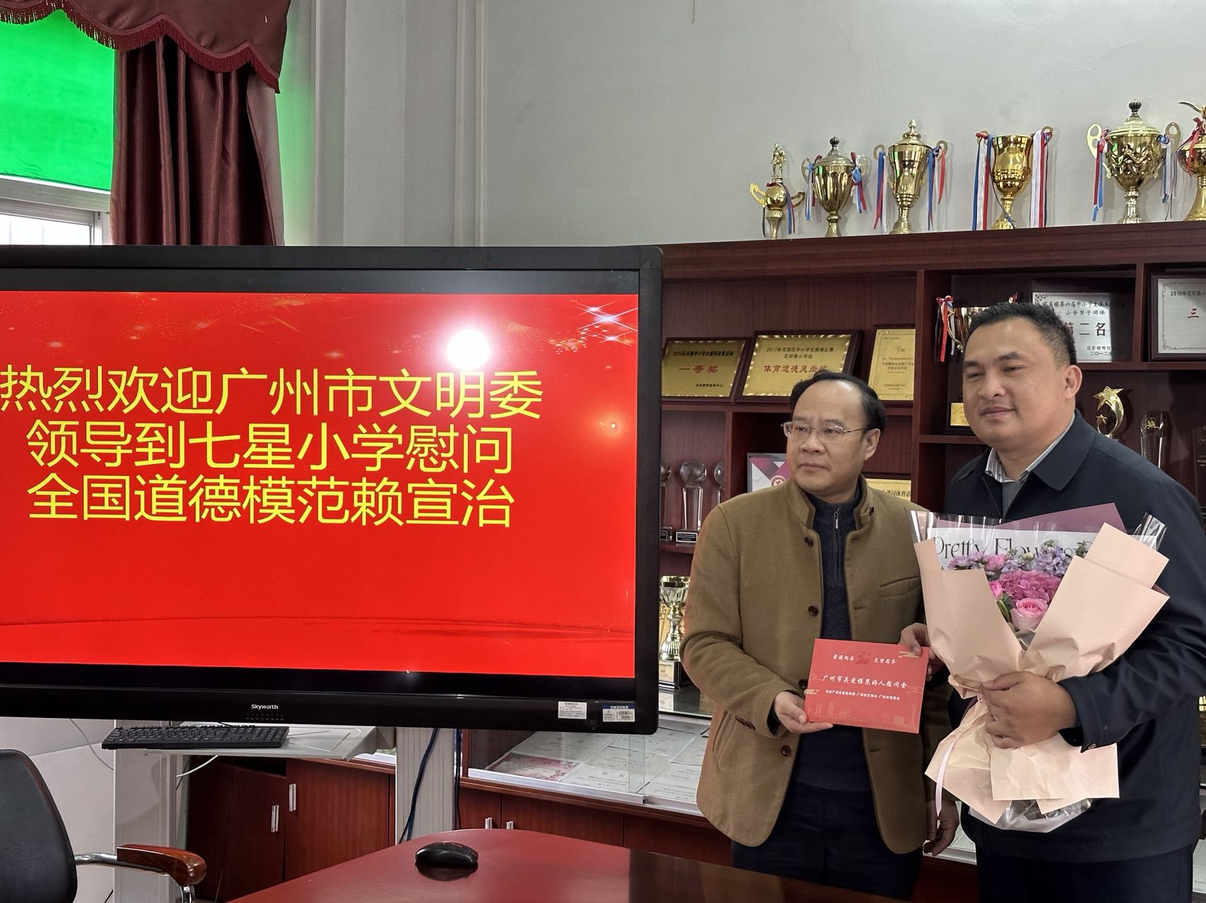 值新春佳节到来之际,广州市文明委组织开展慰问道德模范、身边好人活动。17日上午,市委宣传部副部长、市文明办主任鲍炜走进广州花都区花东镇七星小学,慰问全国道德模范、七星小学副校长赖宣治,送上慰问品与新年祝福。广州市文明委、花都区委宣传部相关负责同志陪同慰问。
