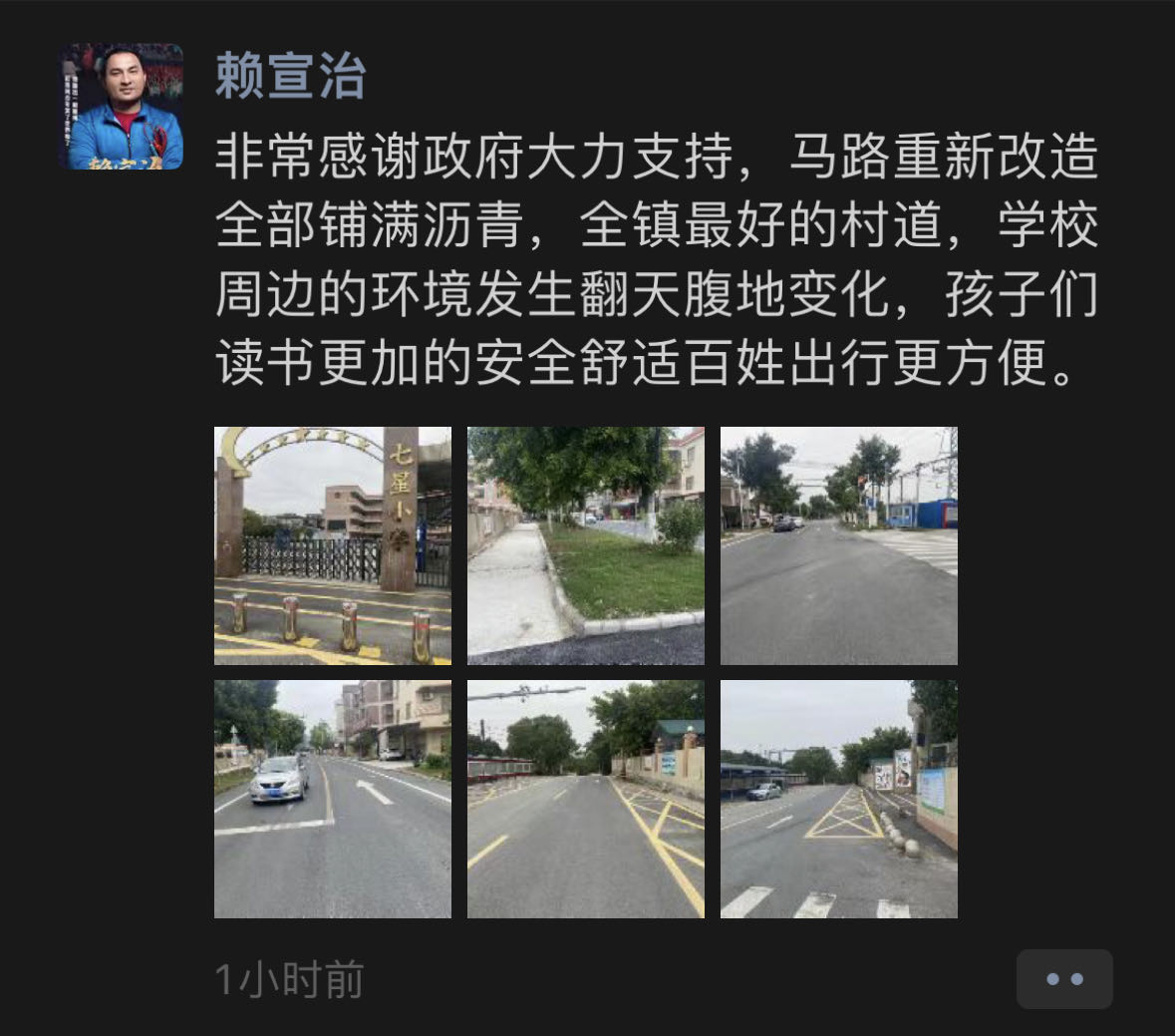 17日当天,赖宣治早早在朋友圈为校门口马路的改造工程完工点赞。他说,自己亲身经历了花东镇翻天覆地的变化,七星小学的发展更见证了政府对教育和民生事业的大力支持。“我首先会严格要求自己以身作则,也会把党和政府对一线教师的关怀传达给各位同事,鼓励大家在新一年开创新业绩。”